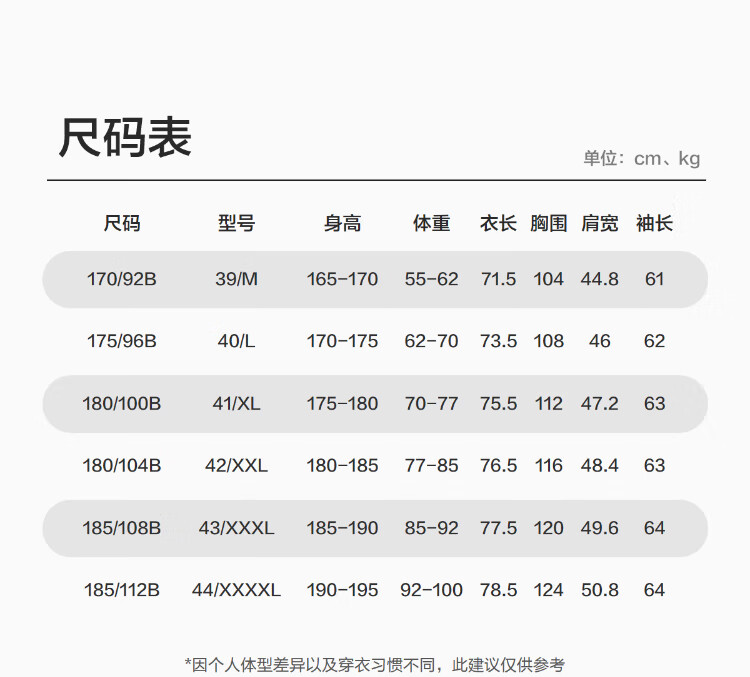 China (cm) 160-165/84-86 165-170 / 88-90 167-172 / 92-96 168-173 / 98-102 170-176 / 106-110