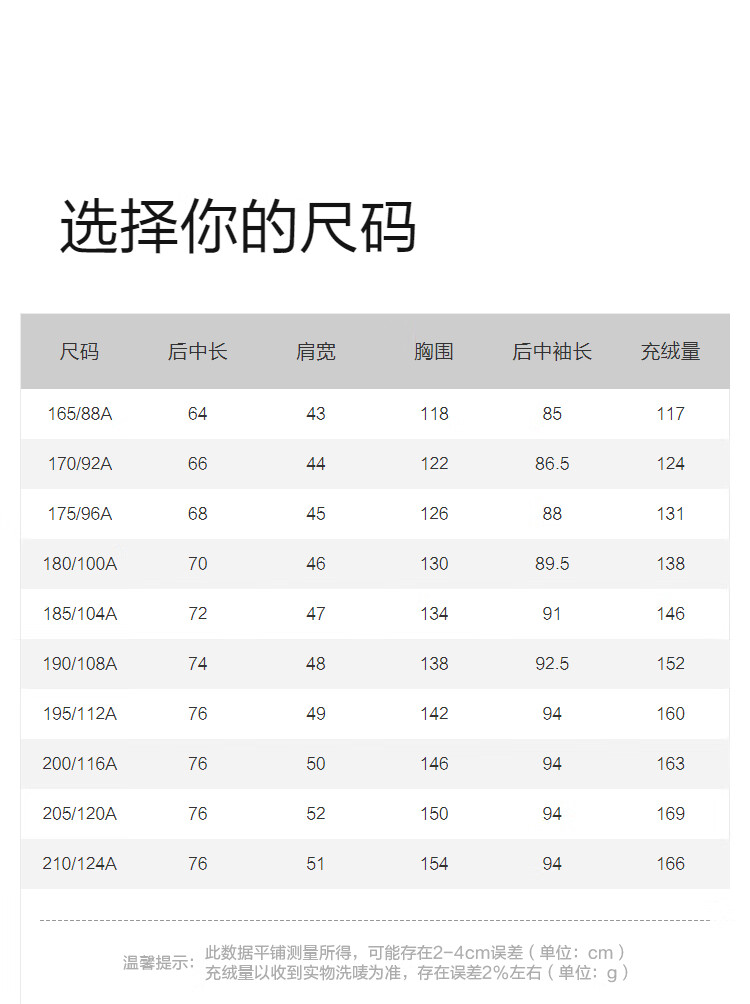 China (cm) 165 / 88-90 170 / 96-98 175 / 108-110 180 / 118-122 185 / 126-130