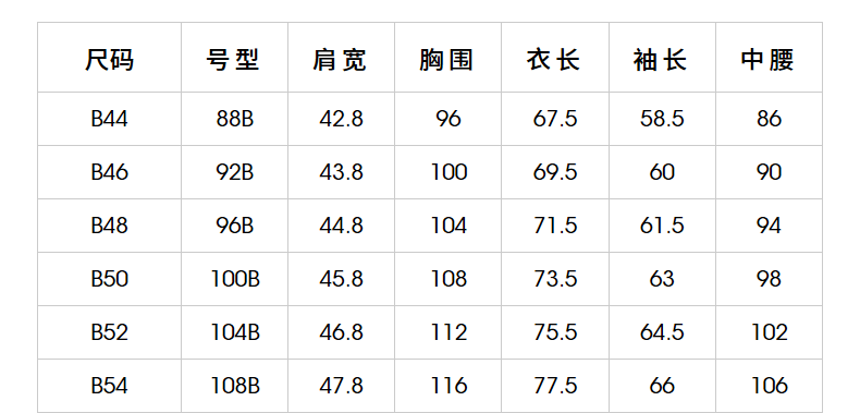 China (cm) 160-165/84-86 165-170 / 88-90 167-172 / 92-96 168-173 / 98-102 170-176 / 106-110