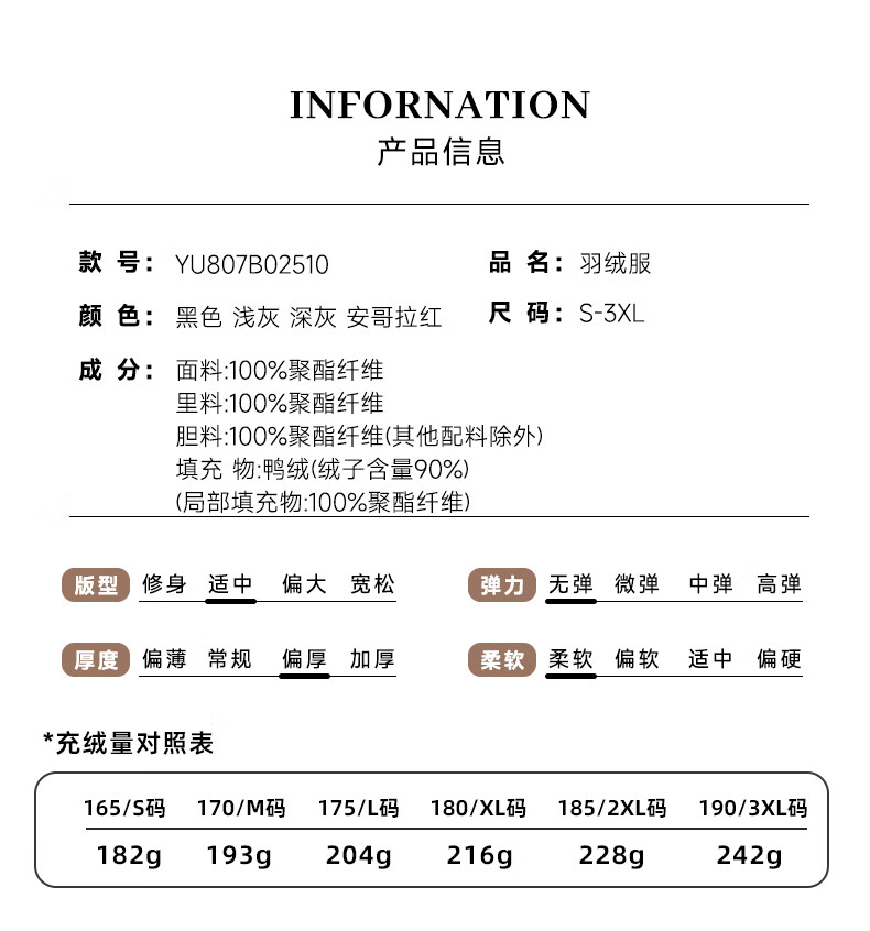 China (cm) 165 / 88-90 170 / 96-98 175 / 108-110 180 / 118-122 185 / 126-130