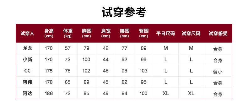 China (cm) 165 / 88-90 170 / 96-98 175 / 108-110 180 / 118-122 185 / 126-130