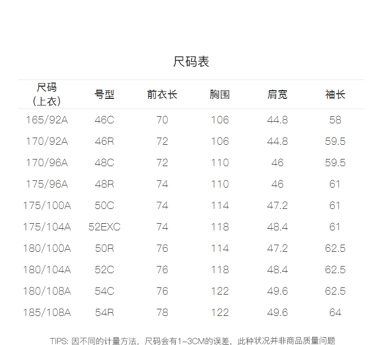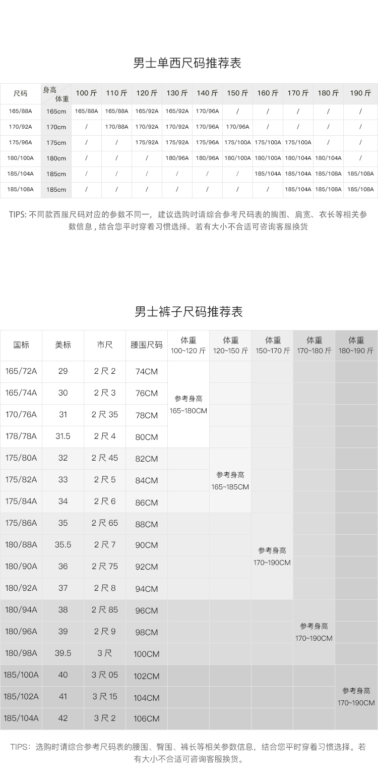 China (cm) 160-165/84-86 165-170 / 88-90 167-172 / 92-96 168-173 / 98-102 170-176 / 106-110