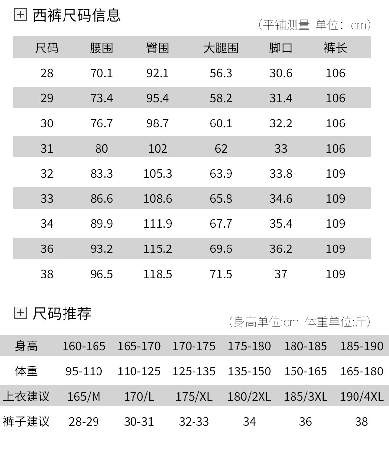 China (cm) 160-165/84-86 165-170 / 88-90 167-172 / 92-96 168-173 / 98-102 170-176 / 106-110