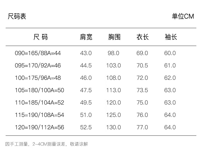 China (cm) 160-165/84-86 165-170 / 88-90 167-172 / 92-96 168-173 / 98-102 170-176 / 106-110