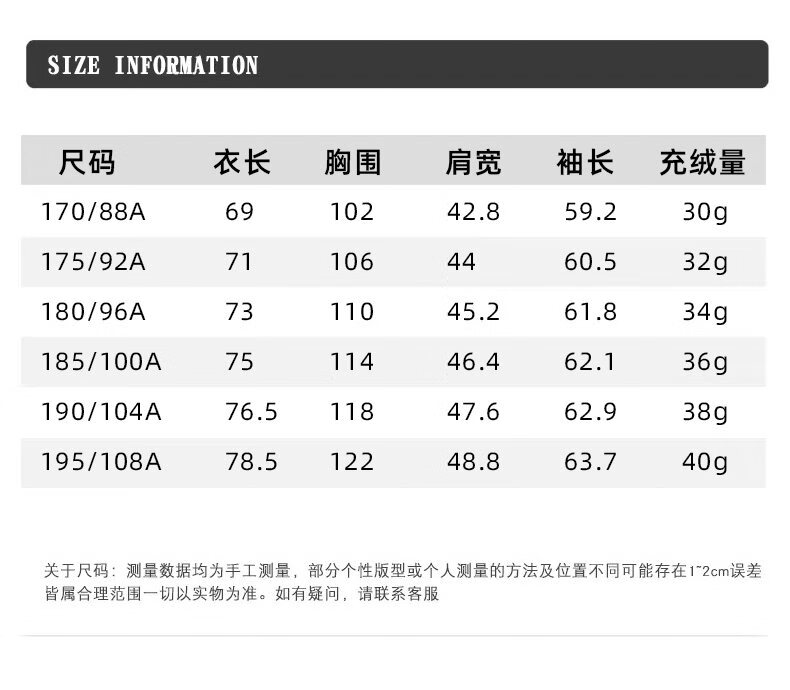 China (cm) 165 / 88-90 170 / 96-98 175 / 108-110 180 / 118-122 185 / 126-130