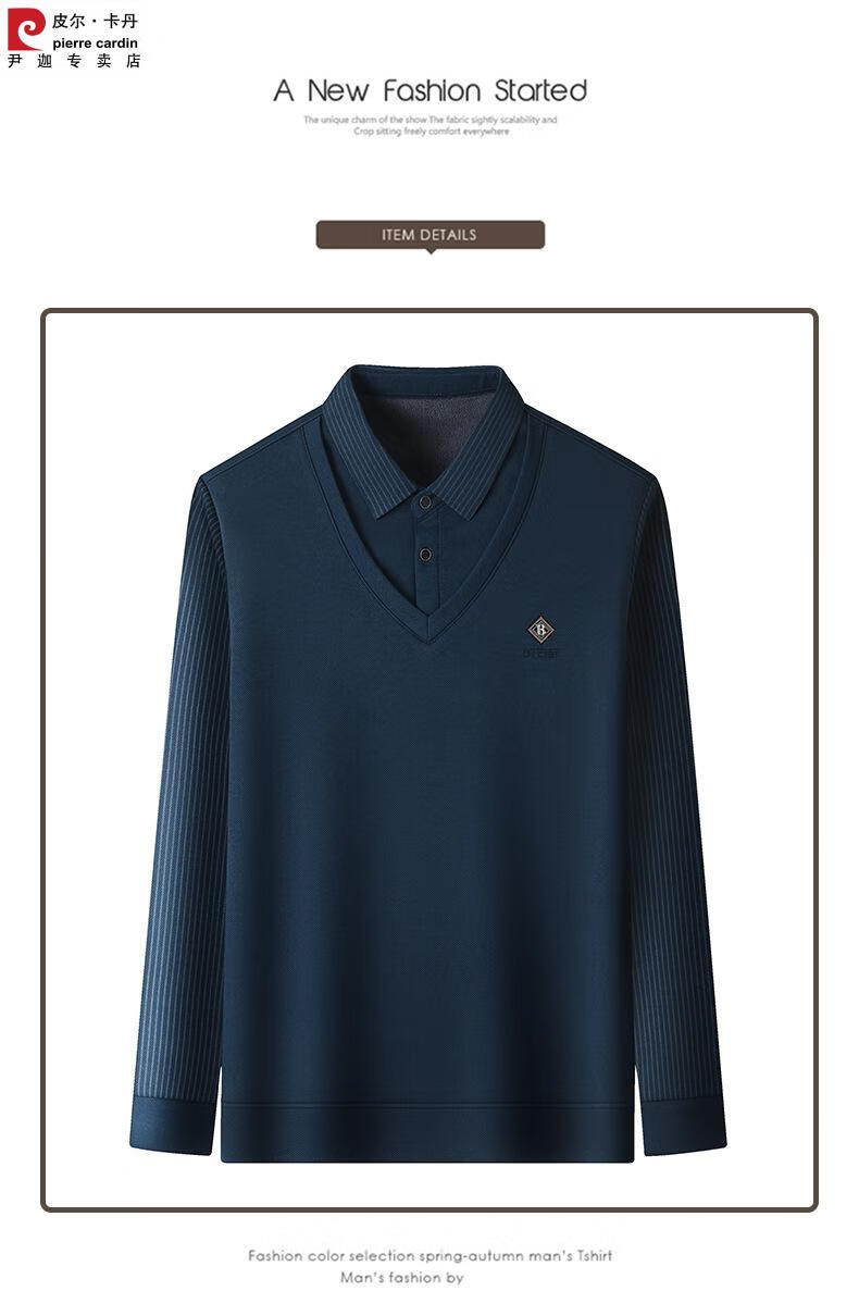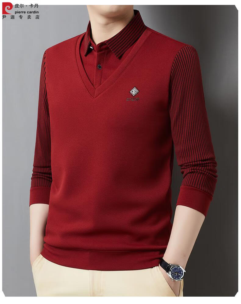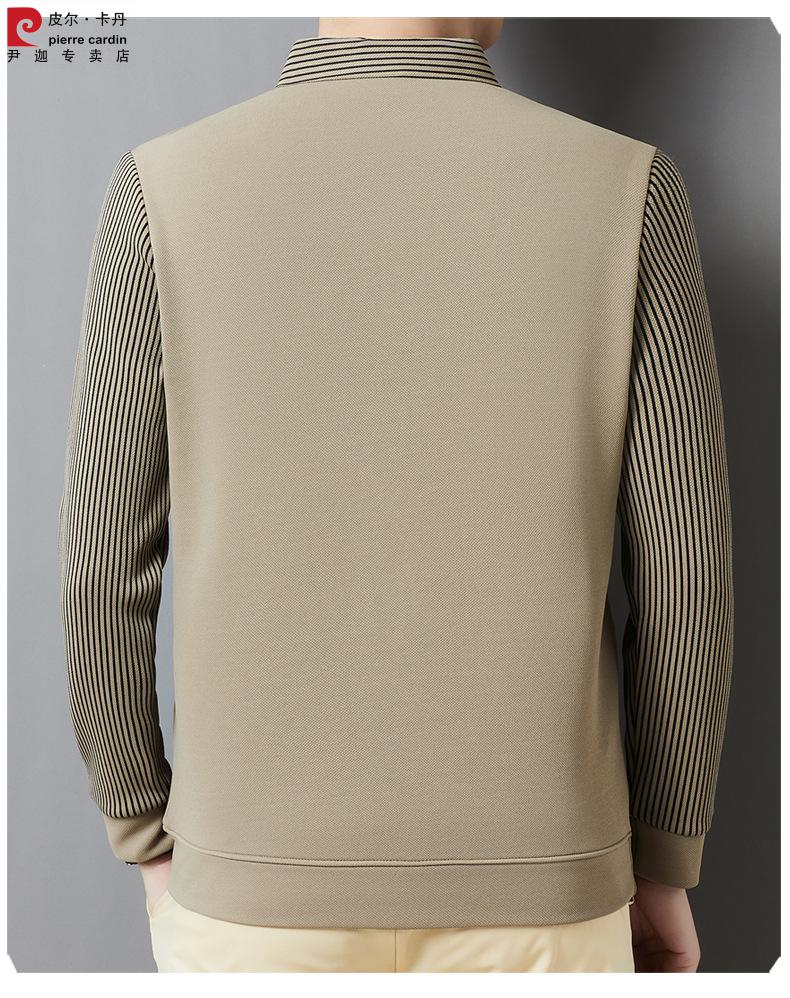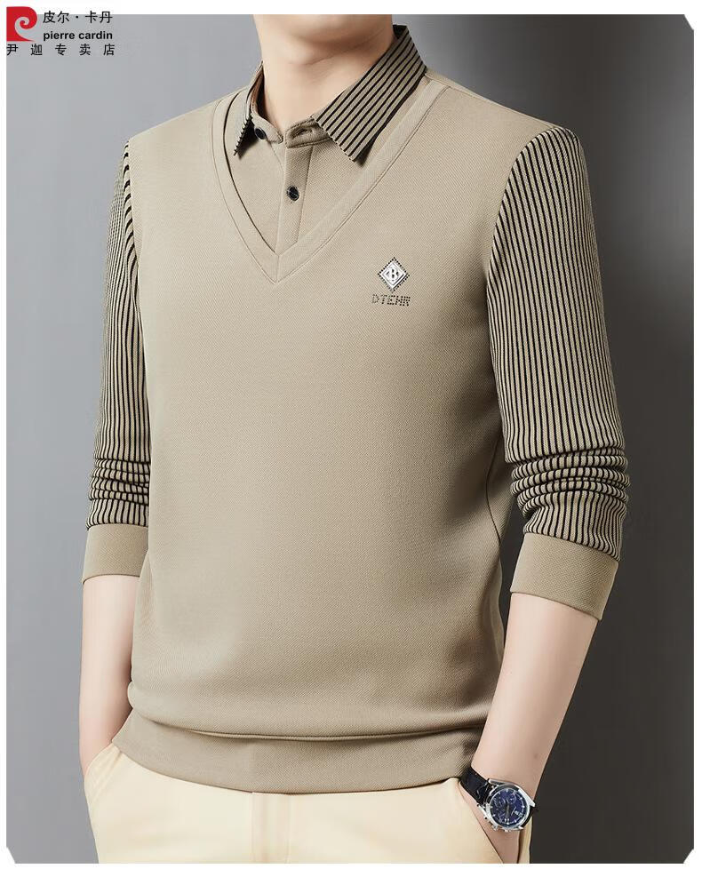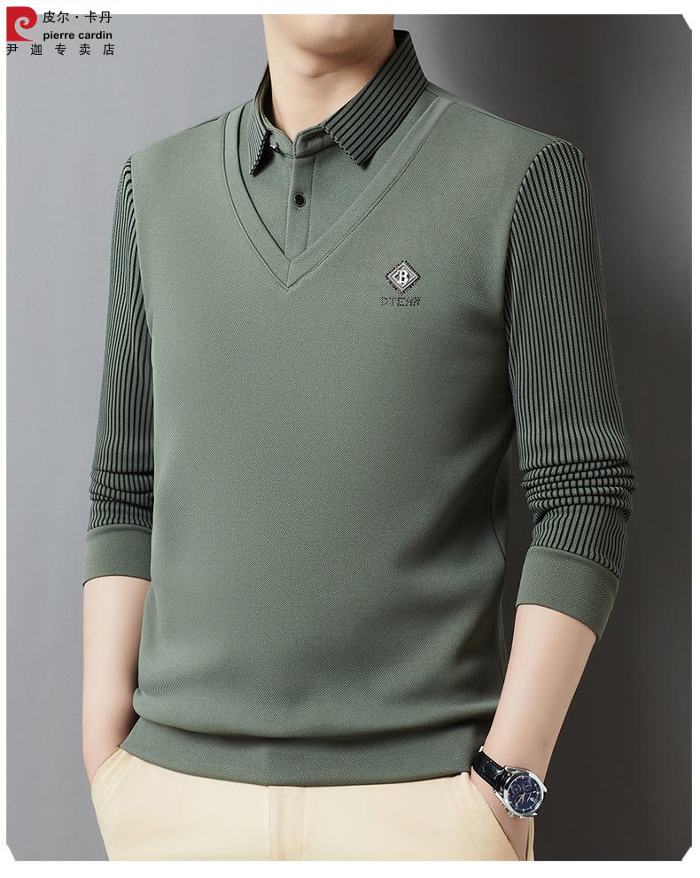 Pierre Cardin brand autumn and winter men's fake two-piece velvet collar striped casual pullover bottoming shirt men's top khaki 4XL 130-