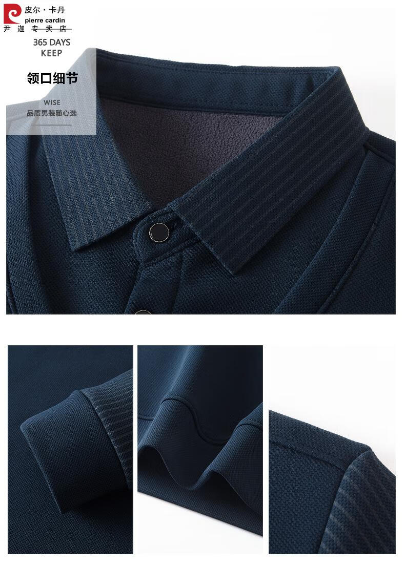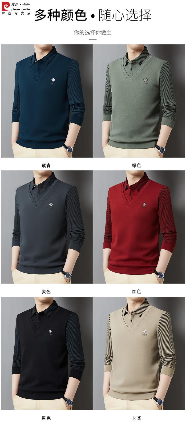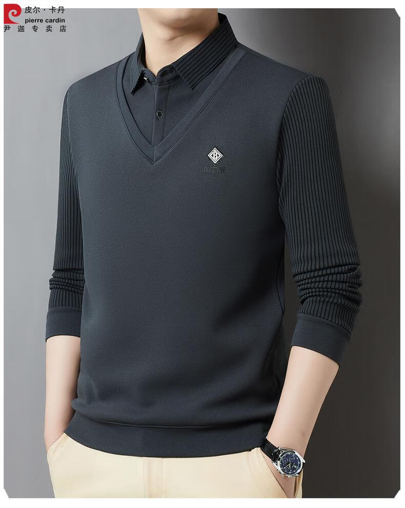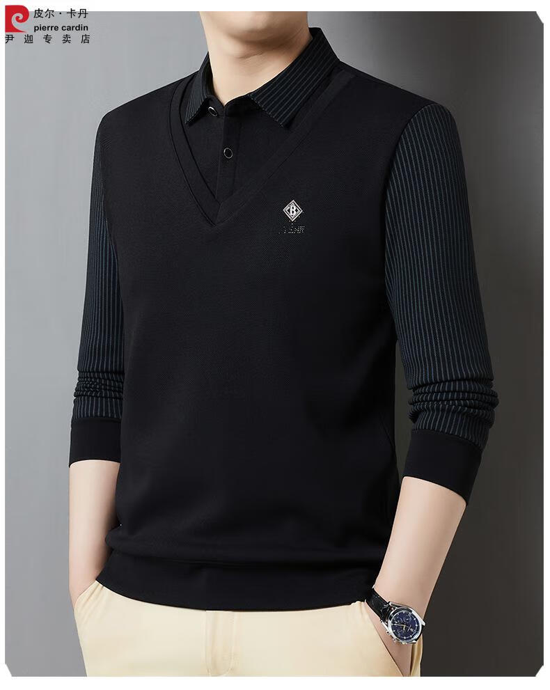 Pierre Cardin brand autumn and winter men's fake two-piece velvet collar striped casual pullover bottoming shirt men's top khaki 4XL 130-