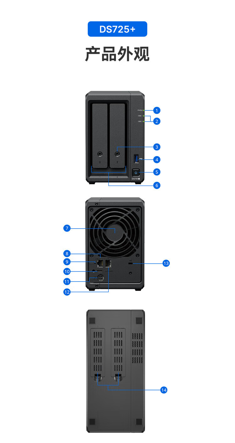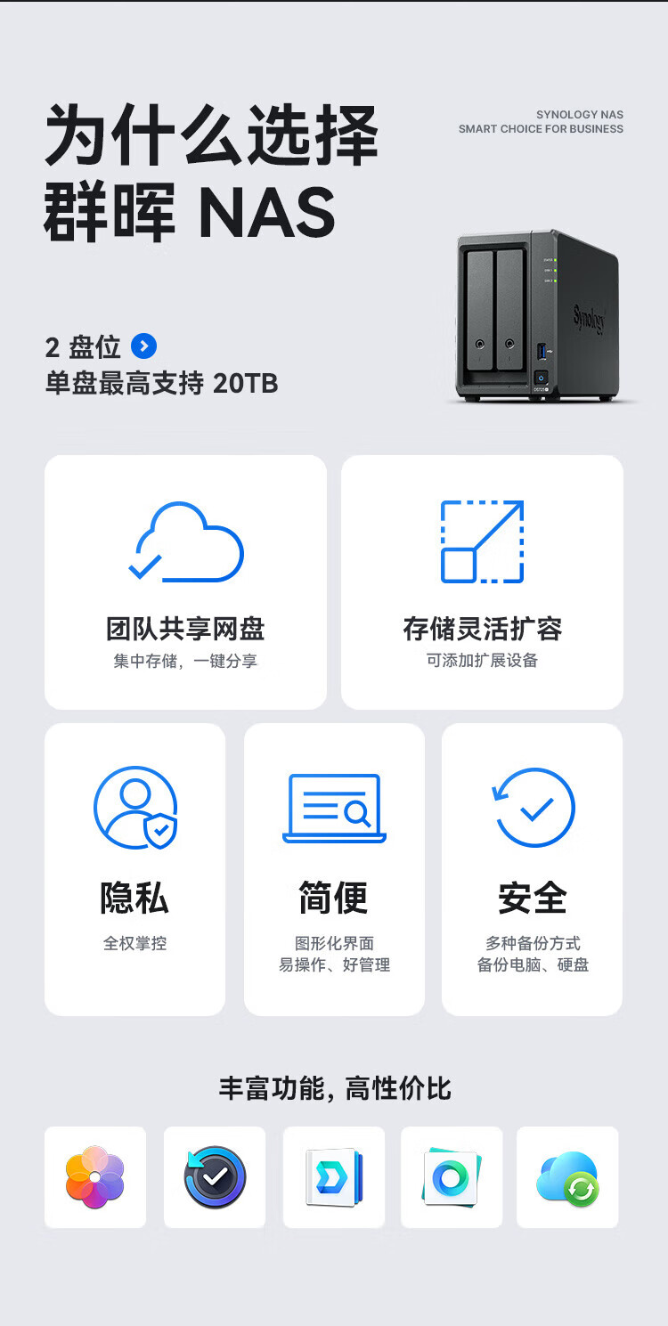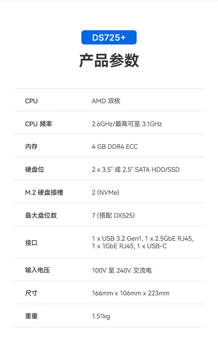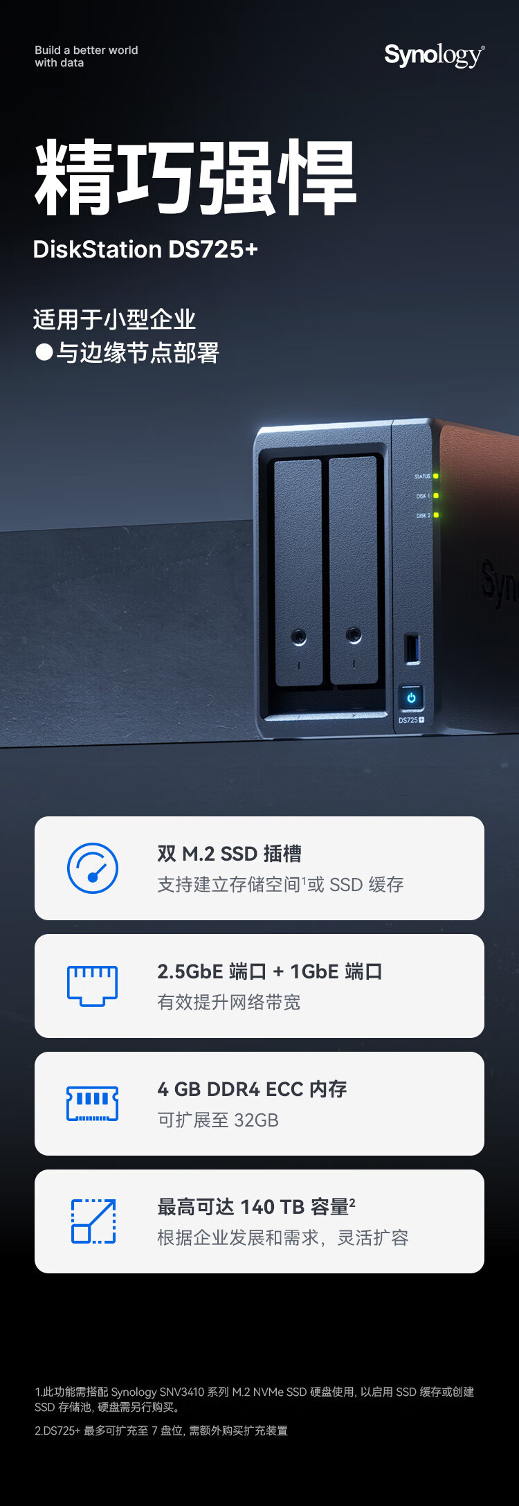 群晖(Synology)DS725+ 双核心 两盘位 NAS网络存储服务器 企业团队办公私有云 文件存储共享 数据管理 黑色 标配(不含硬盘)