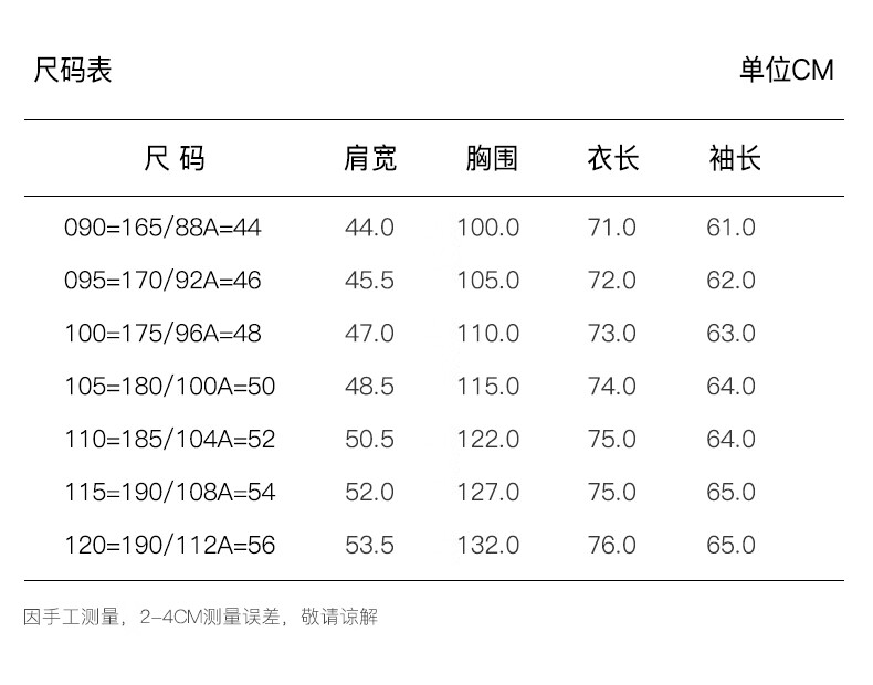 China (cm) 160-165/84-86 165-170 / 88-90 167-172 / 92-96 168-173 / 98-102 170-176 / 106-110
