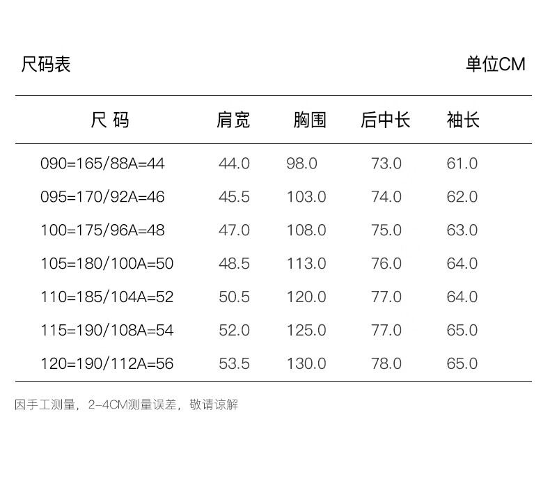 China (cm) 160-165/84-86 165-170 / 88-90 167-172 / 92-96 168-173 / 98-102 170-176 / 106-110
