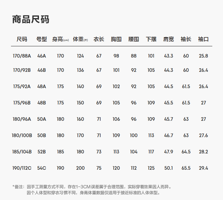 China (cm) 160-165/84-86 165-170 / 88-90 167-172 / 92-96 168-173 / 98-102 170-176 / 106-110