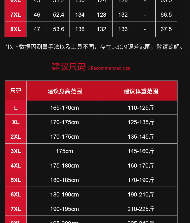 China (cm) 165 / 88-90 170 / 96-98 175 / 108-110 180 / 118-122 185 / 126-130