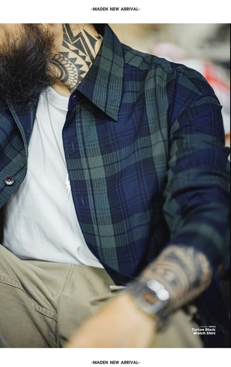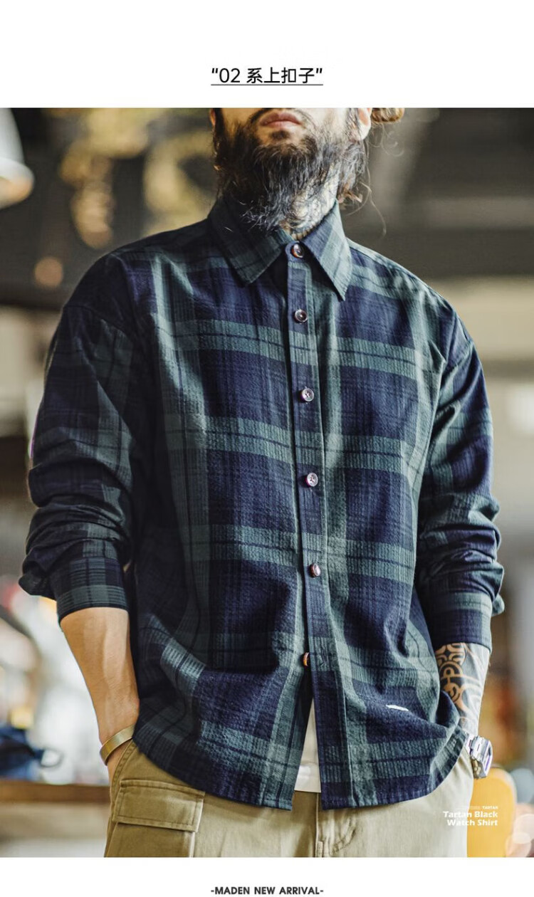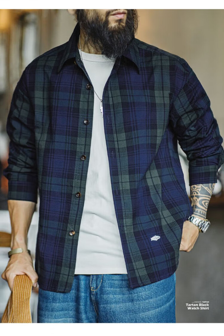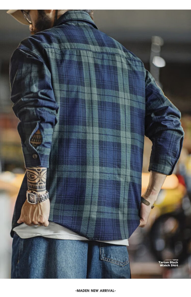Рабочая одежда Madden, американская ретро сине-зеленая клетчатая рубашка с длинными рукавами, тонкая рубашка с текстурой из чистого хлопка, мужская осенняя сине-зеленая клетчатая рубашка M