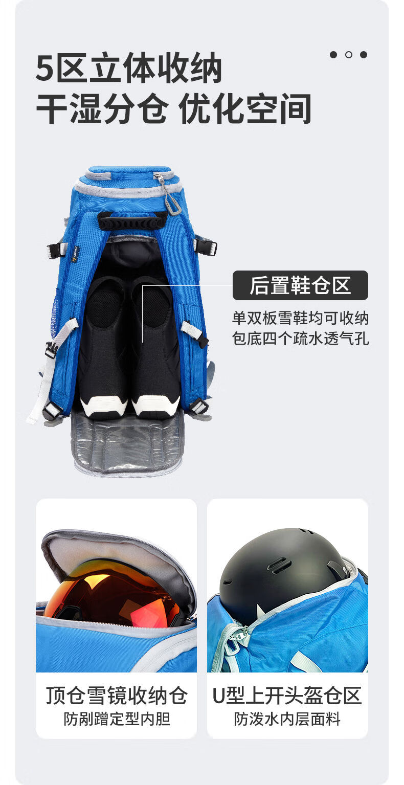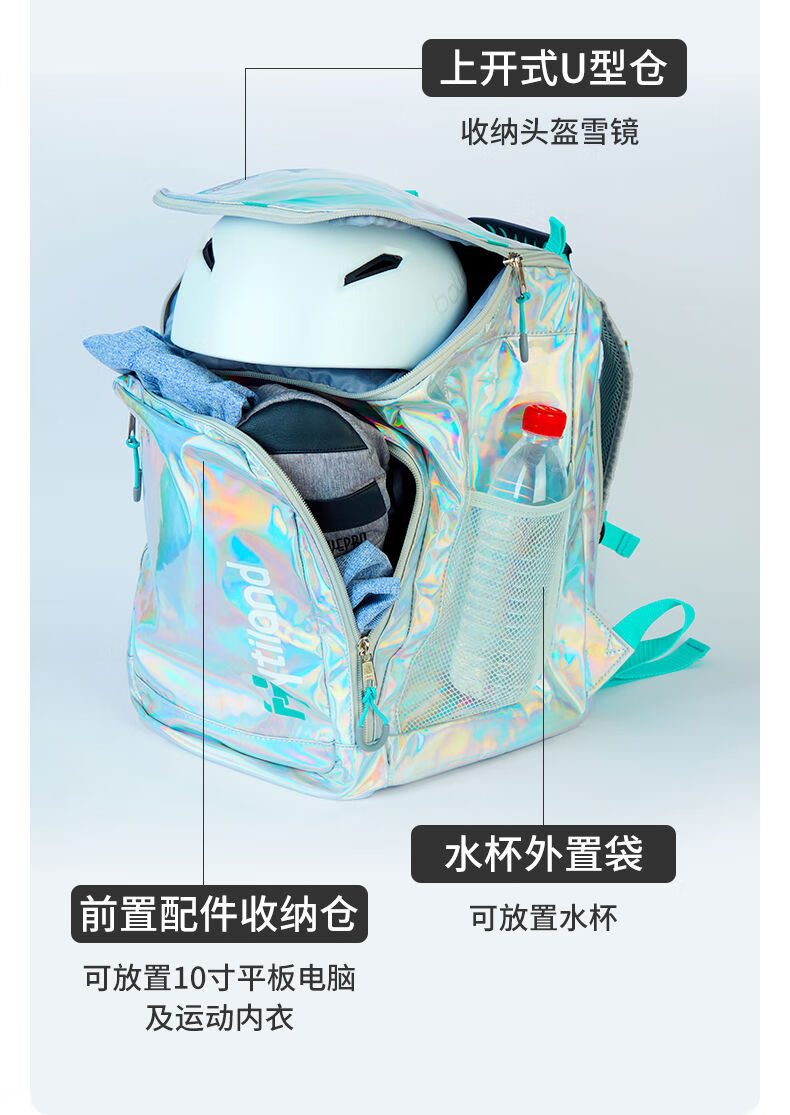 Ski boots for single and double board, roller skates, skates, shoes, wet and dry compartments, children's multifunctional ski backpack, laser silver 32L