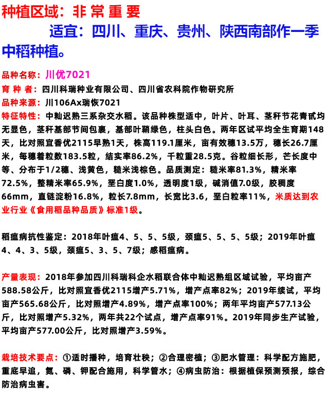 Long-grain fragrant rice Chuanyou 7021 rice seed national standard first-grade fragrant rice has a soft taste but not glutinous and chewy Chuanyou 7021 500g/bag 1 bag