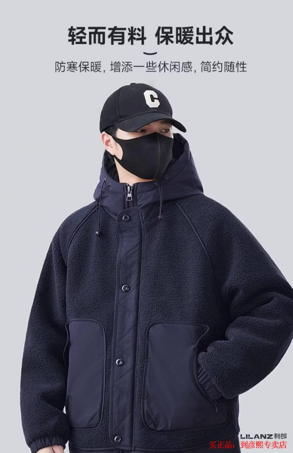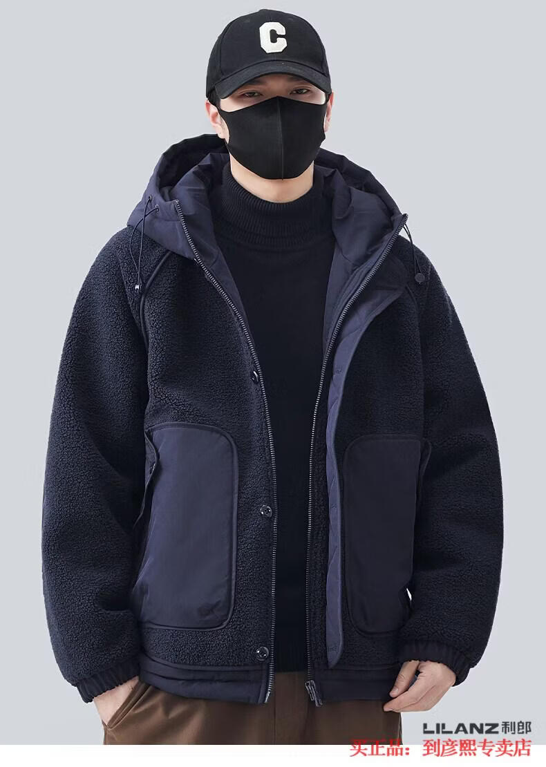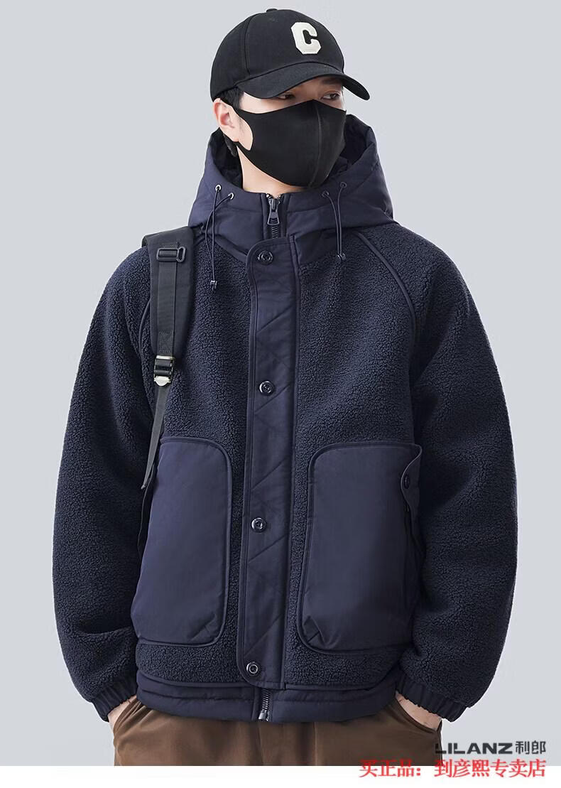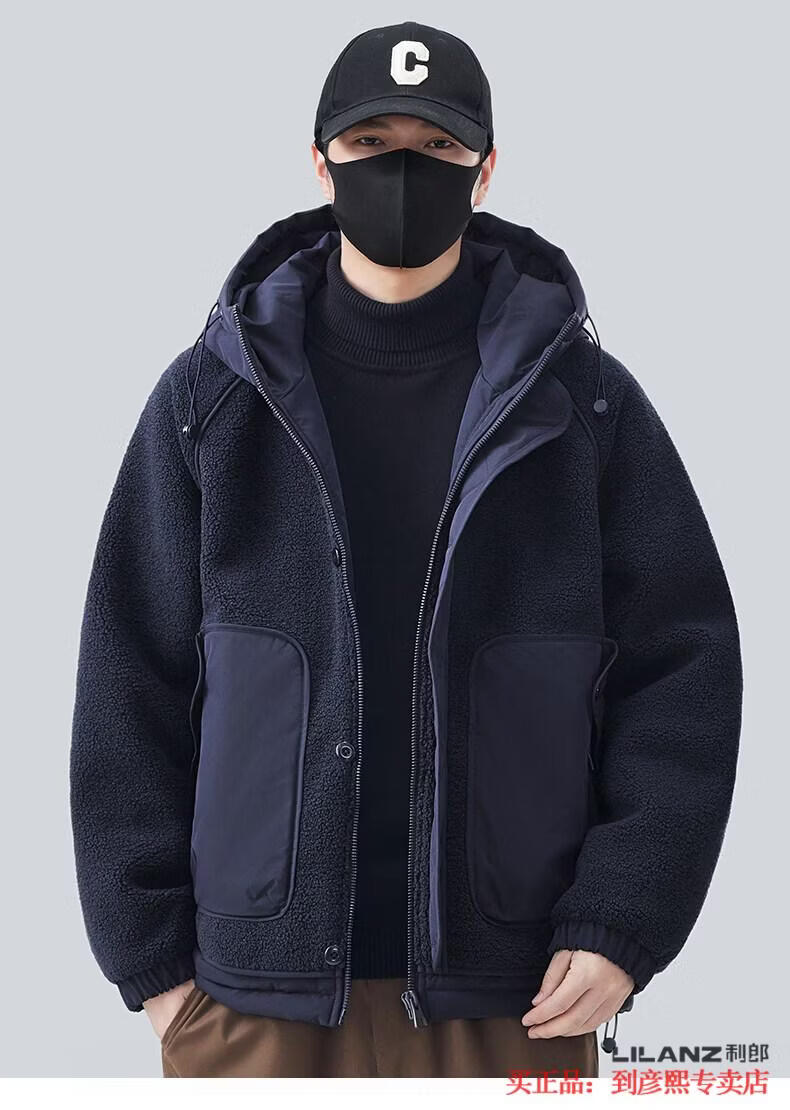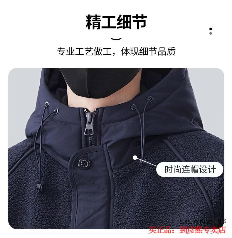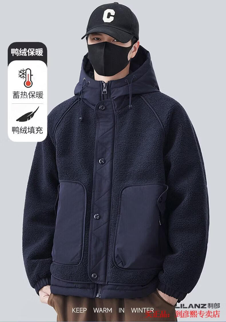 利郎(LILANZ)官方羊羔毛羽绒服男款冬季2025新款潮加厚保暖连帽摇粒绒外套男士 藏青-旗舰款 L 【130-150斤】