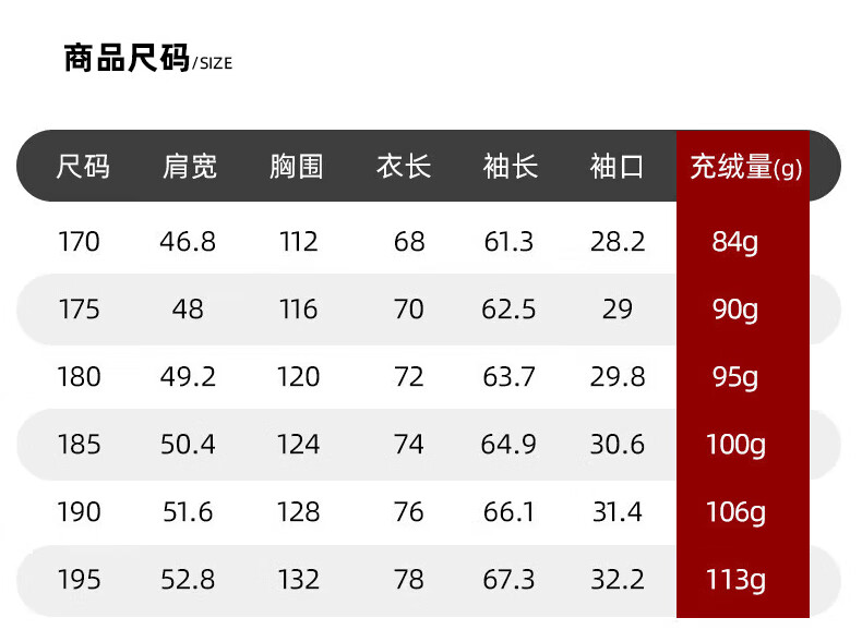 China (cm) 165 / 88-90 170 / 96-98 175 / 108-110 180 / 118-122 185 / 126-130