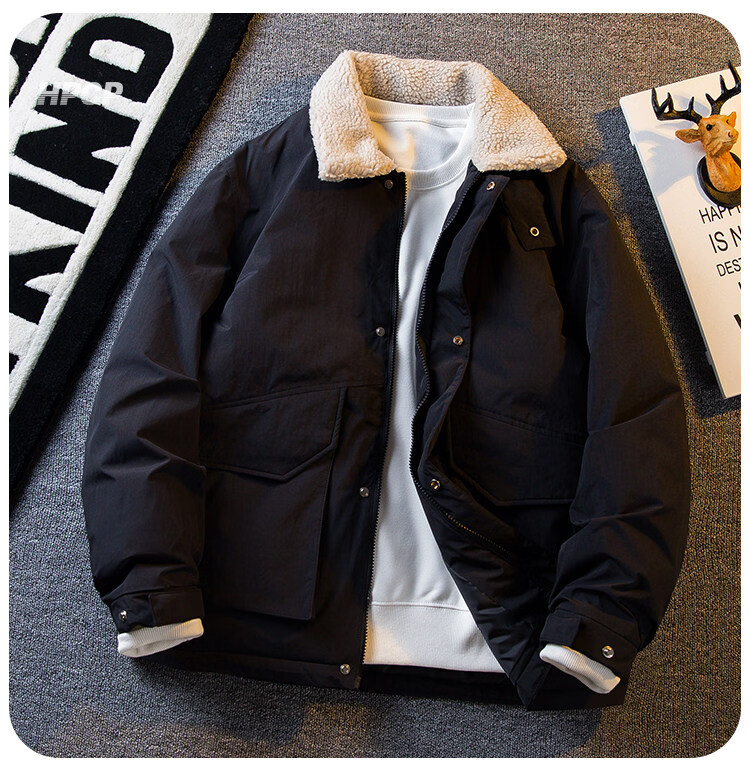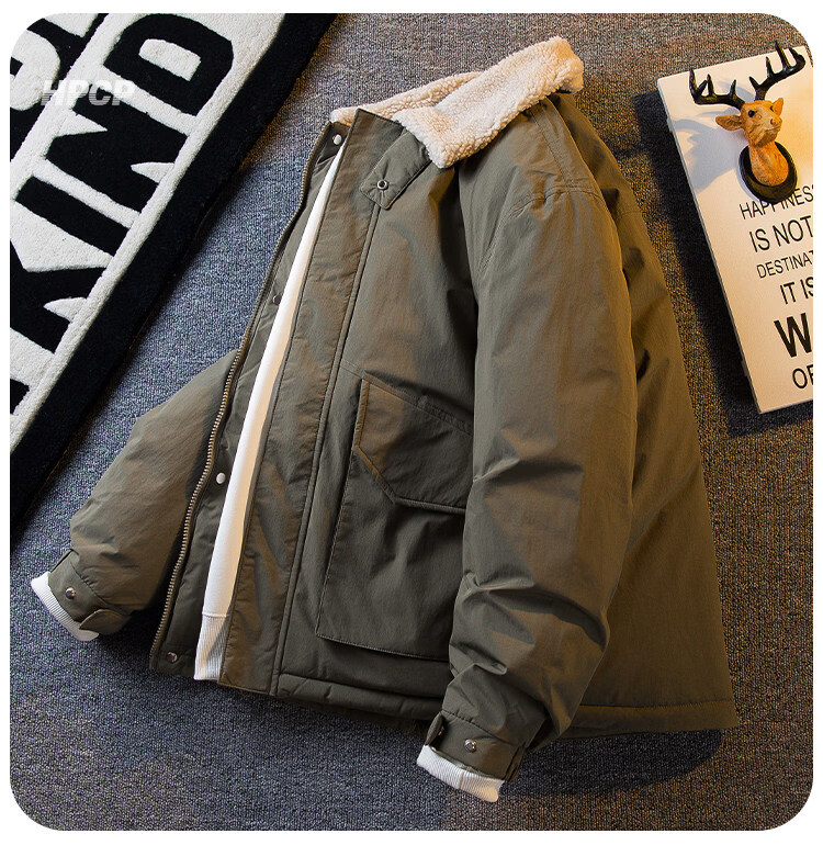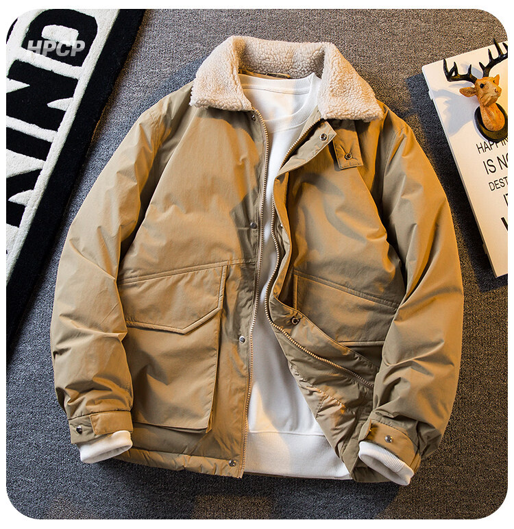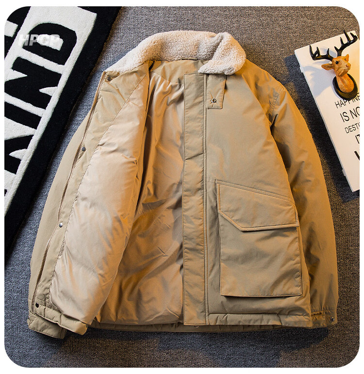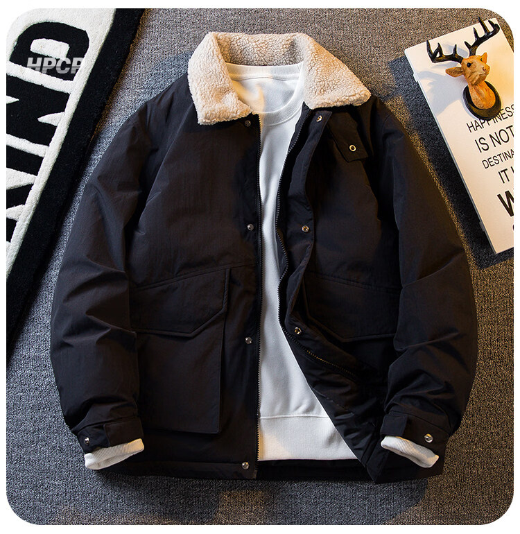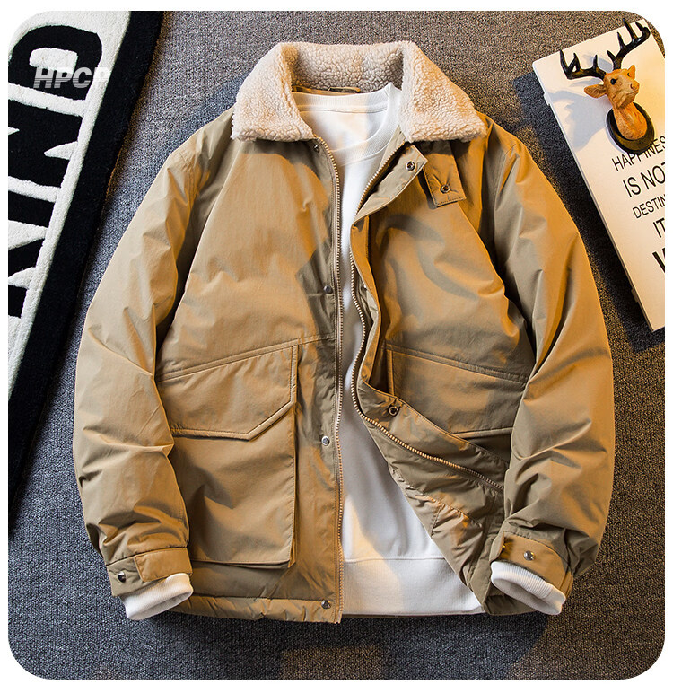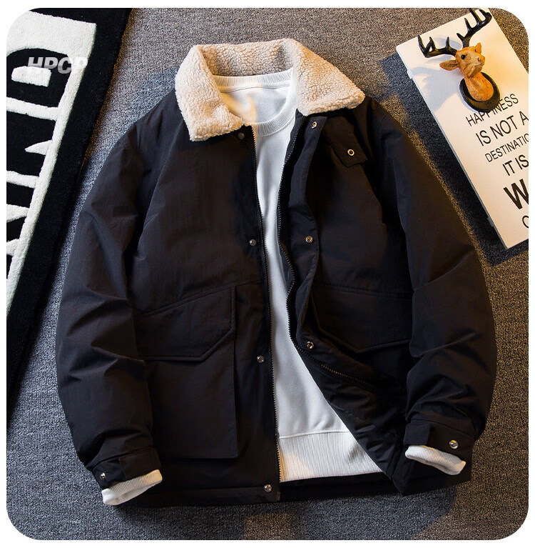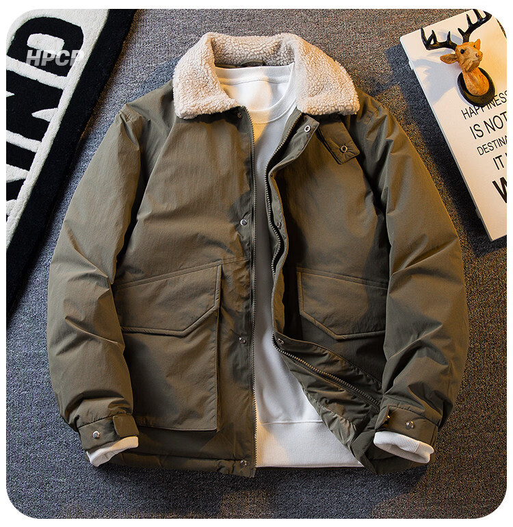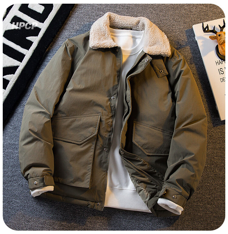 花花公子加厚保暖羊羔领工装羽绒服男秋冬日系覆古工装外套男 军绿色 90绒 L (121-140斤)