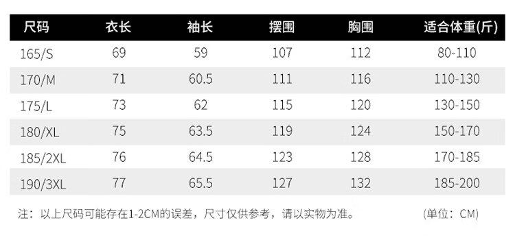 China (cm) 165 / 88-90 170 / 96-98 175 / 108-110 180 / 118-122 185 / 126-130