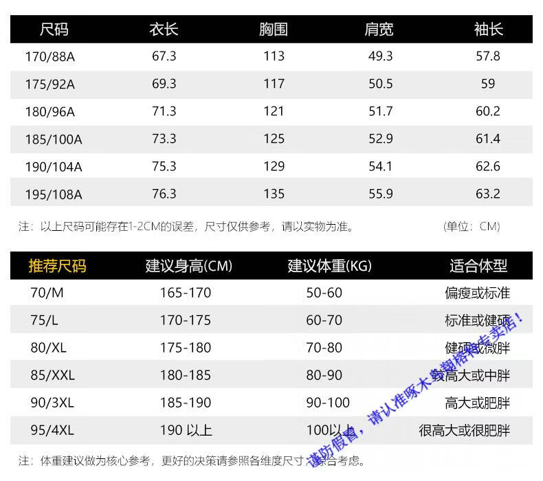 China (cm) 165 / 88-90 170 / 96-98 175 / 108-110 180 / 118-122 185 / 126-130