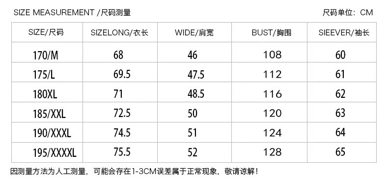 China (cm) 165 / 88-90 170 / 96-98 175 / 108-110 180 / 118-122 185 / 126-130