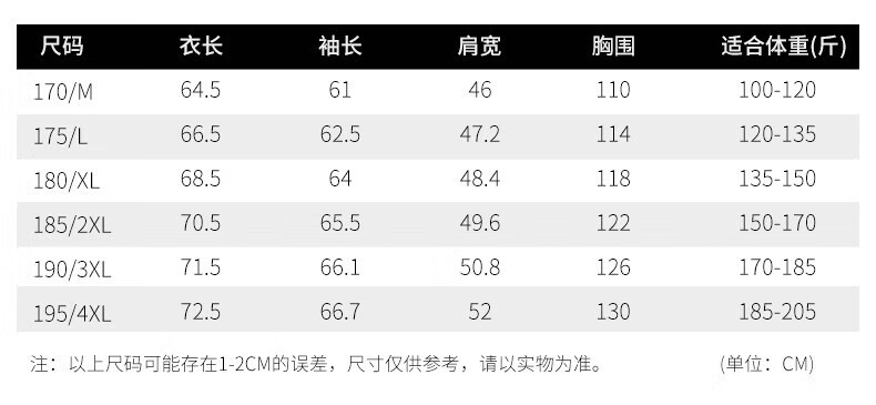 China (cm) 165 / 88-90 170 / 96-98 175 / 108-110 180 / 118-122 185 / 126-130
