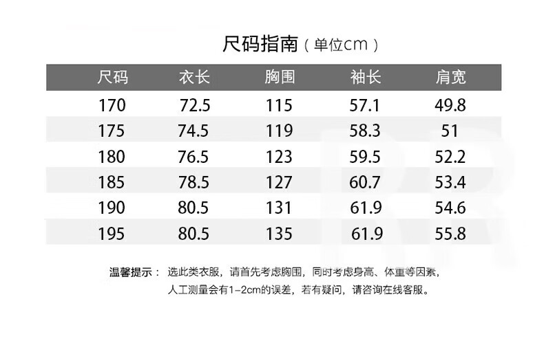 China (cm) 165 / 88-90 170 / 96-98 175 / 108-110 180 / 118-122 185 / 126-130