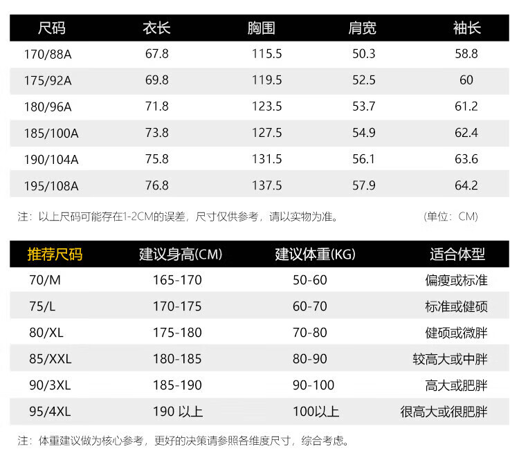 China (cm) 160-165/84-86 165-170 / 88-90 167-172 / 92-96 168-173 / 98-102 170-176 / 106-110