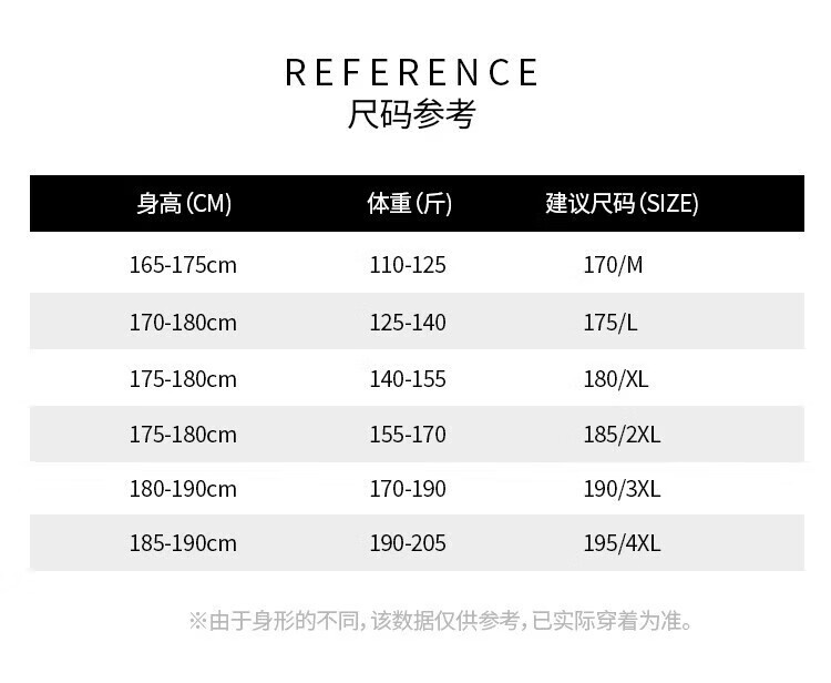 China (cm) 165 / 88-90 170 / 96-98 175 / 108-110 180 / 118-122 185 / 126-130
