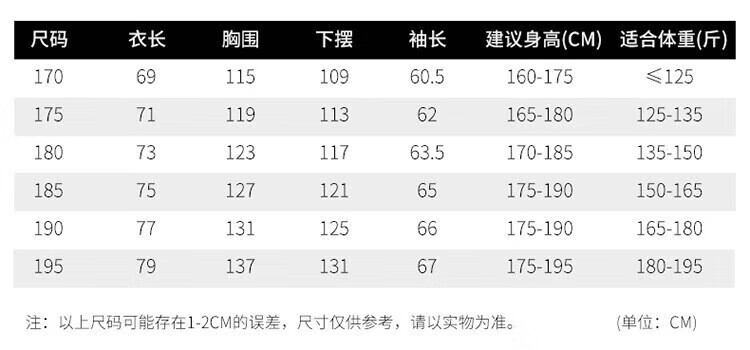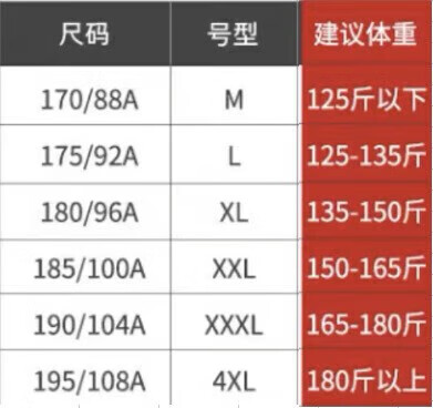 China (cm) 165 / 88-90 170 / 96-98 175 / 108-110 180 / 118-122 185 / 126-130