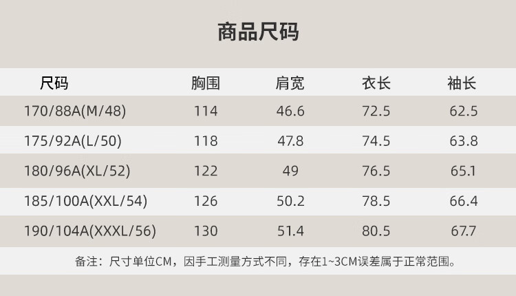 China (cm) 165 / 88-90 170 / 96-98 175 / 108-110 180 / 118-122 185 / 126-130