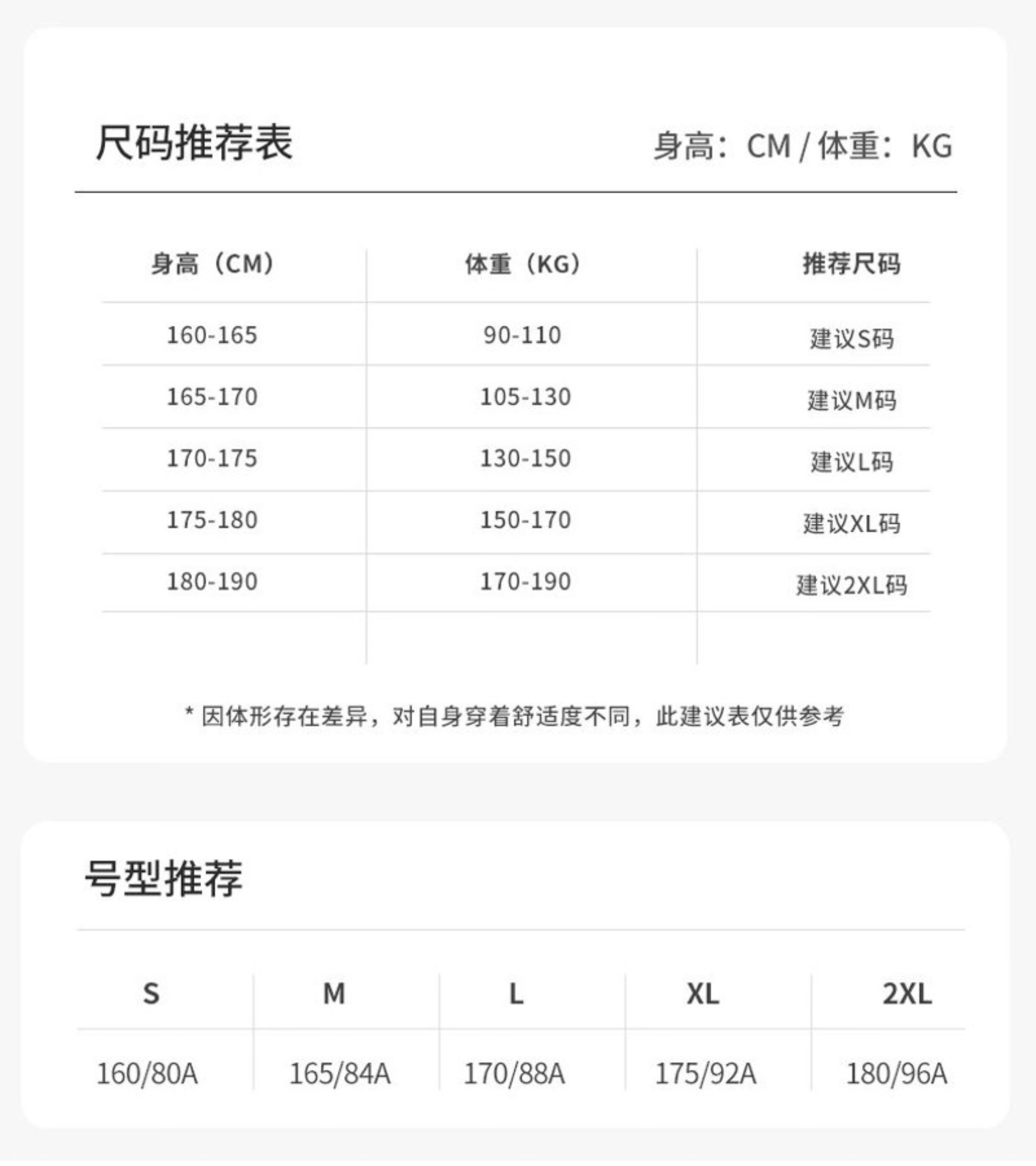 China (cm) 160-165/84-86 165-170 / 88-90 167-172 / 92-96 168-173 / 98-102 170-176 / 106-110