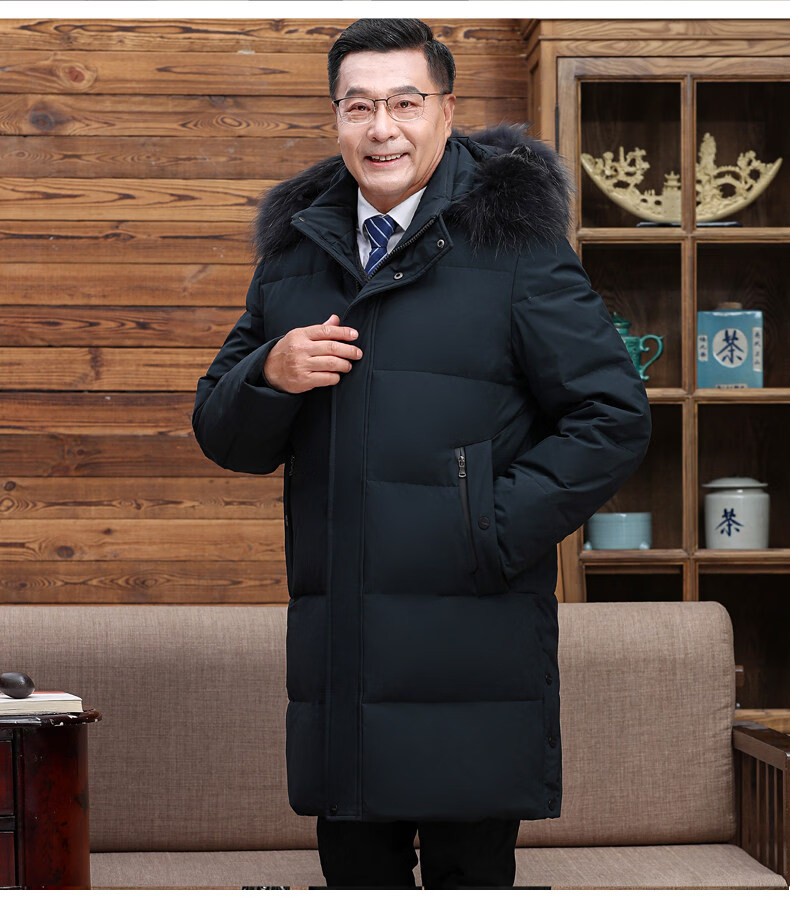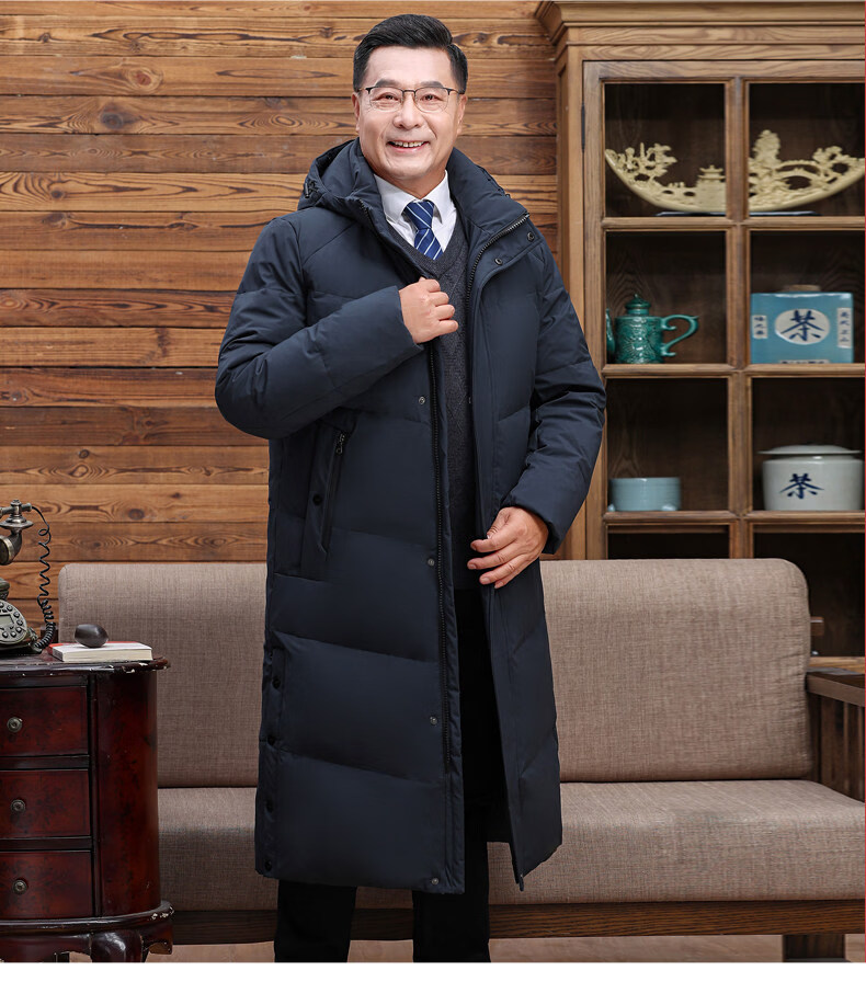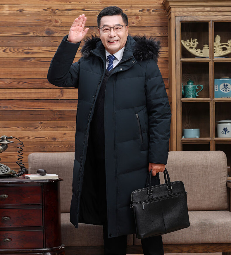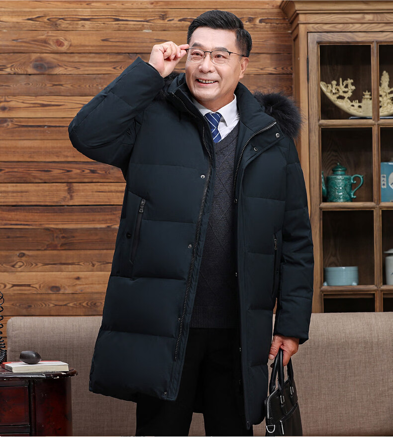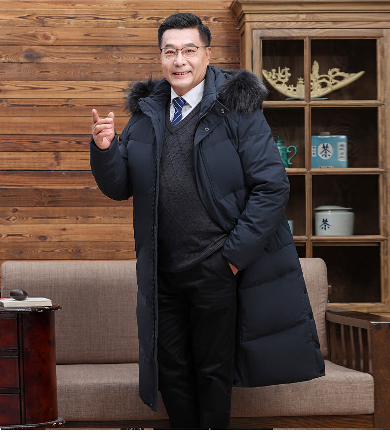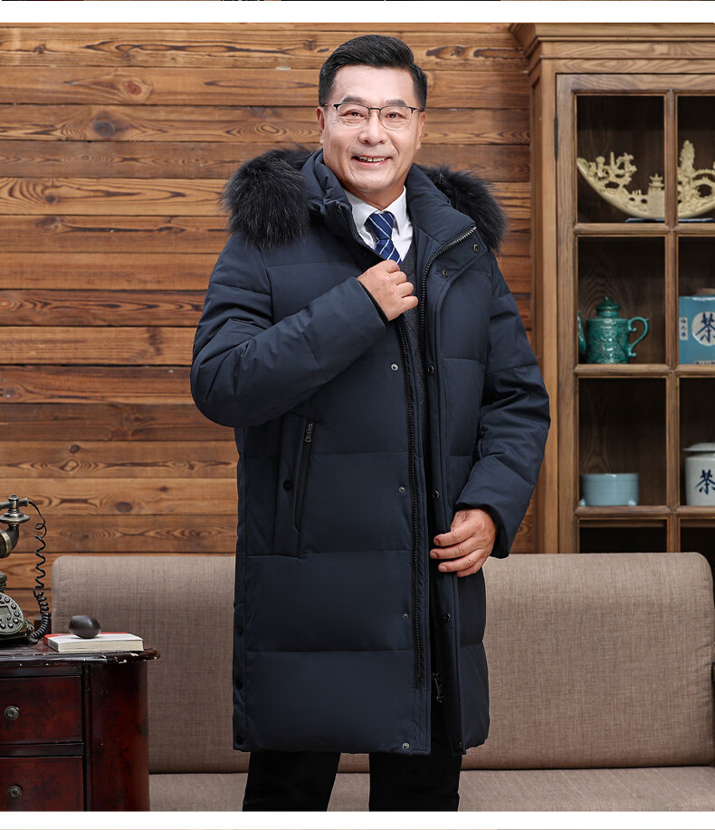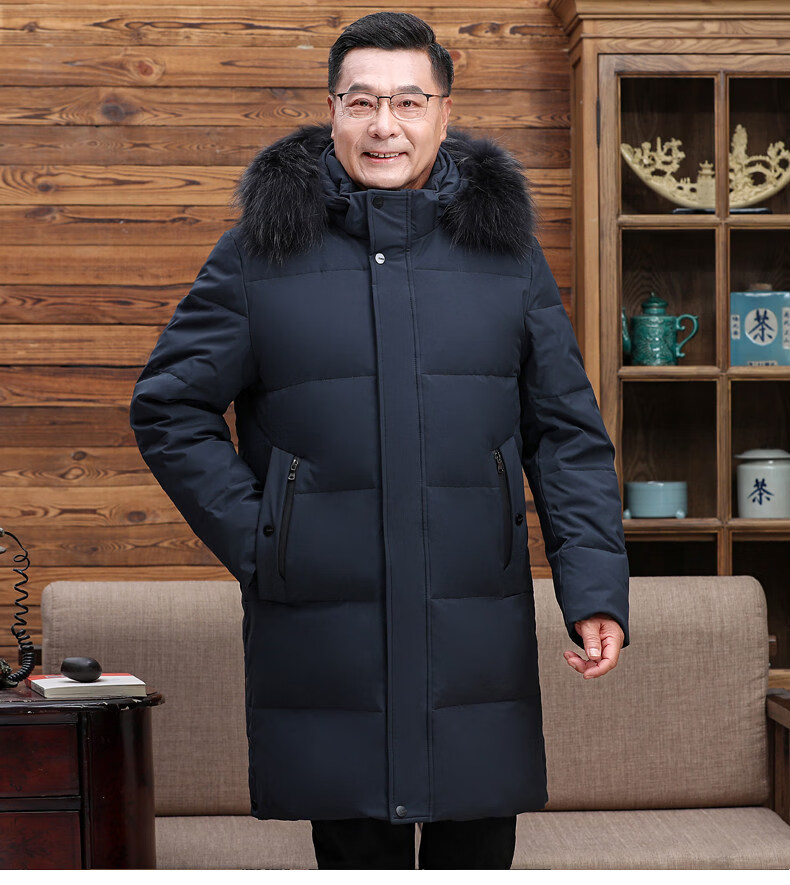 Hengyuanxiang среднего и пожилого возраста пуховик мужской длинный до колена утепленный свободный белый утиный пух средней длины для папы зимнее пальто HYX-208 верхний голубой длинный воротник без волос 2XL 185 160-180Jin Jin равен 0,5 кг