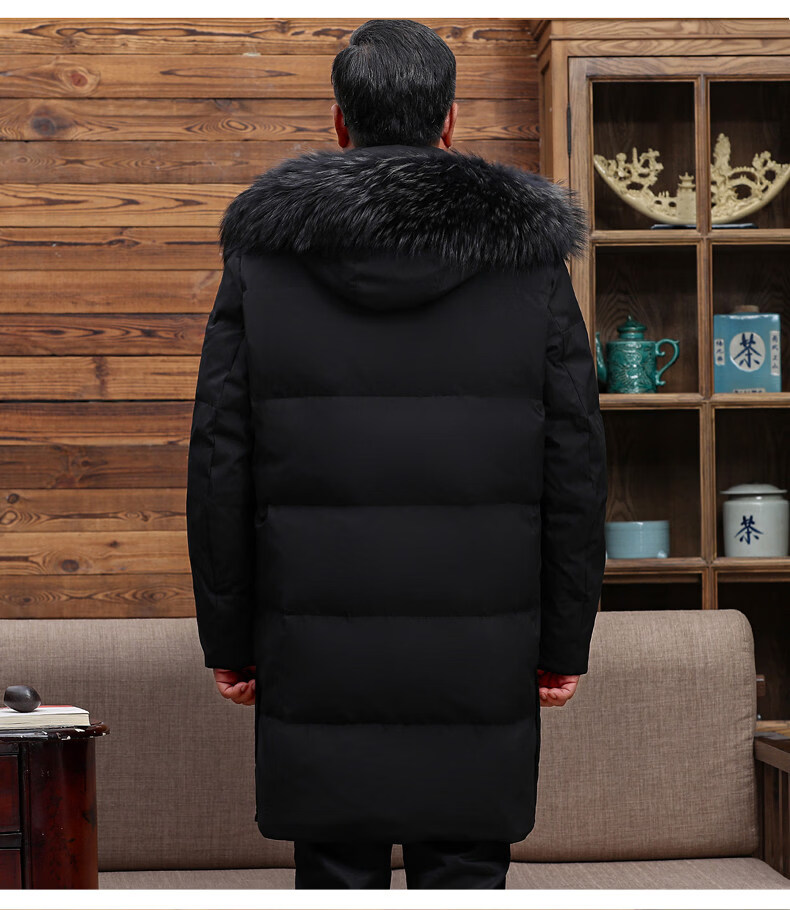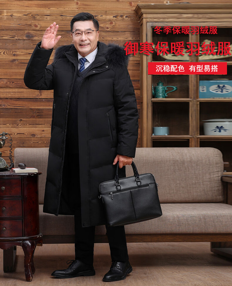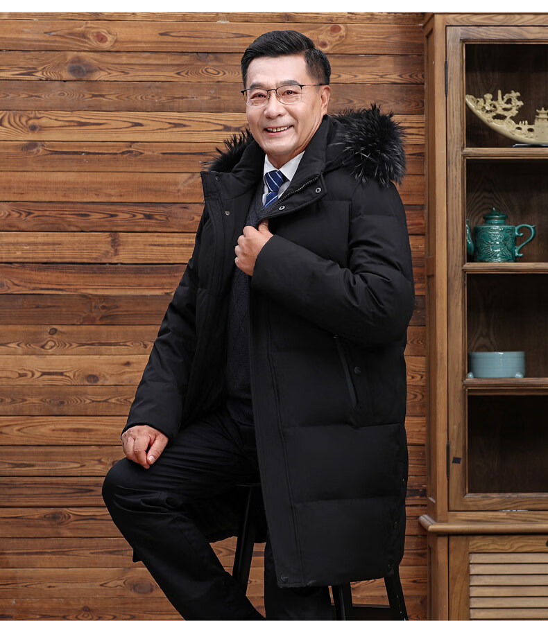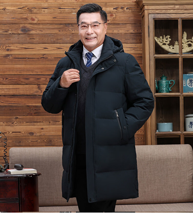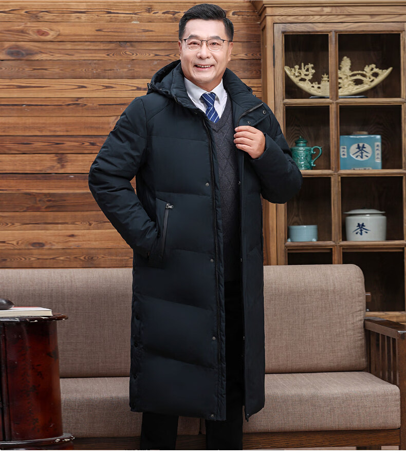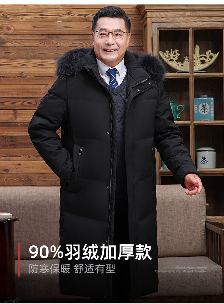 Hengyuanxiang среднего и пожилого возраста пуховик мужской длинный до колена утепленный свободный белый утиный пух средней длины для папы зимнее пальто HYX-208 верхний голубой длинный воротник без волос 2XL 185 160-180Jin Jin равен 0,5 кг
