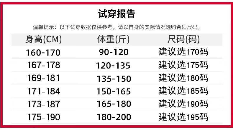 China (cm) 165 / 88-90 170 / 96-98 175 / 108-110 180 / 118-122 185 / 126-130