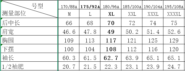 China (cm) 160-165/84-86 165-170 / 88-90 167-172 / 92-96 168-173 / 98-102 170-176 / 106-110