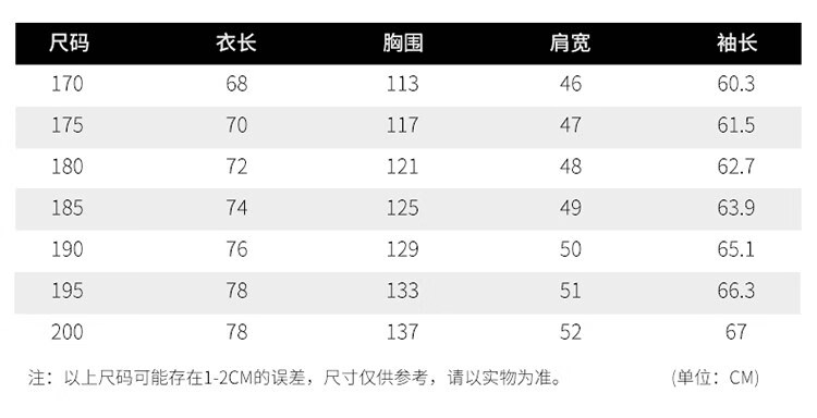 China (cm) 165 / 88-90 170 / 96-98 175 / 108-110 180 / 118-122 185 / 126-130