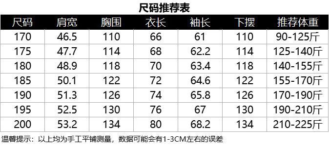 China (cm) 165 / 88-90 170 / 96-98 175 / 108-110 180 / 118-122 185 / 126-130