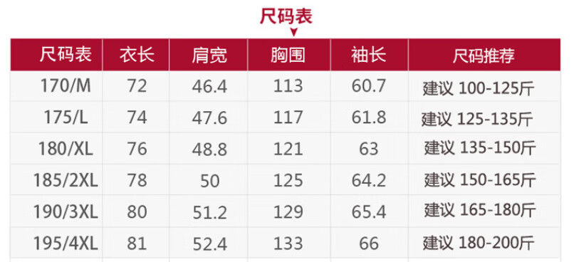 China (cm) 165 / 88-90 170 / 96-98 175 / 108-110 180 / 118-122 185 / 126-130