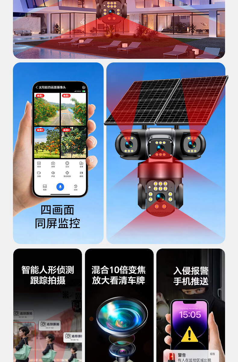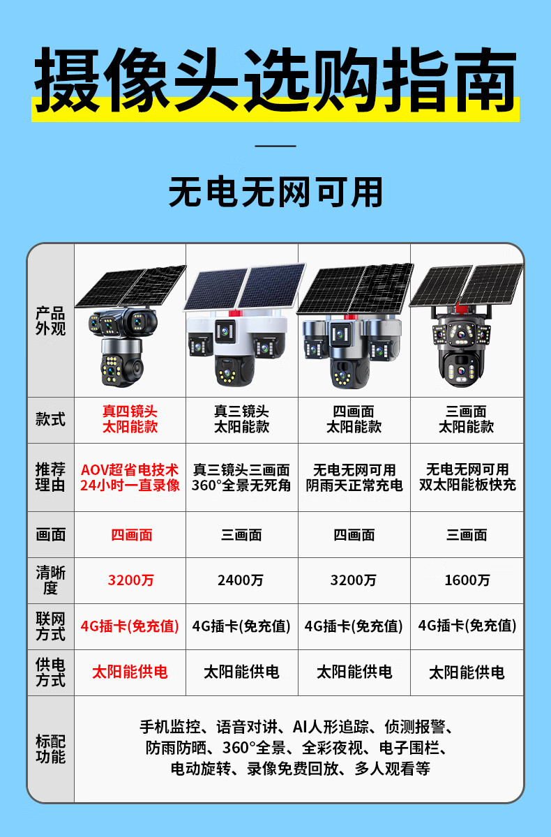 广春多摄太阳能摄像头农村野外4g终身免流量室外看护远程监控器家用360度全彩高清夜视户外免插电 3200万超清+真四镜头+AOV省电+4G终身流量