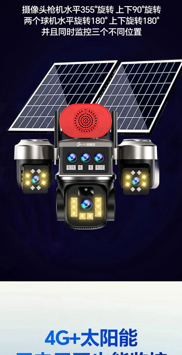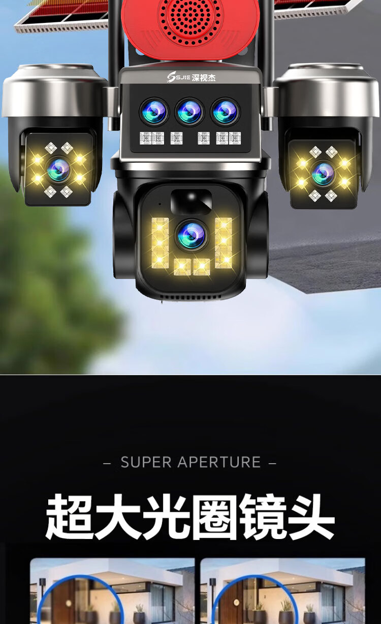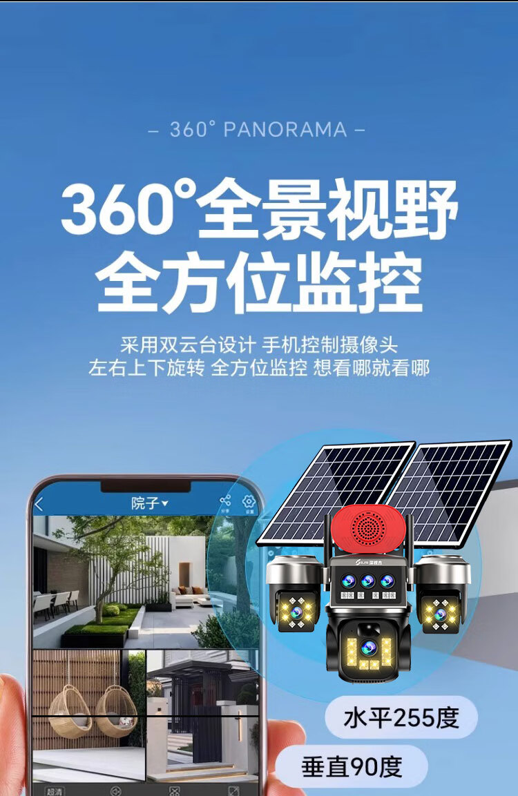 Shenshijie Solar-Monitorkamera, lebenslang ohne Aufladen, 360-Grad-Panoramablick für zu Hause, keine toten Winkel, wasserdicht im Freien, kein Strom, kein Netzwerk, Handy-Fernbedienung, kein Anschließen erforderlich, kein WLAN erforderlich, kein Aufladen, echte Drei-Linse, Drei-Rotations-Fernüberwachung, Tag und Nacht ultraklar, Vollfarbe, Solarenergie