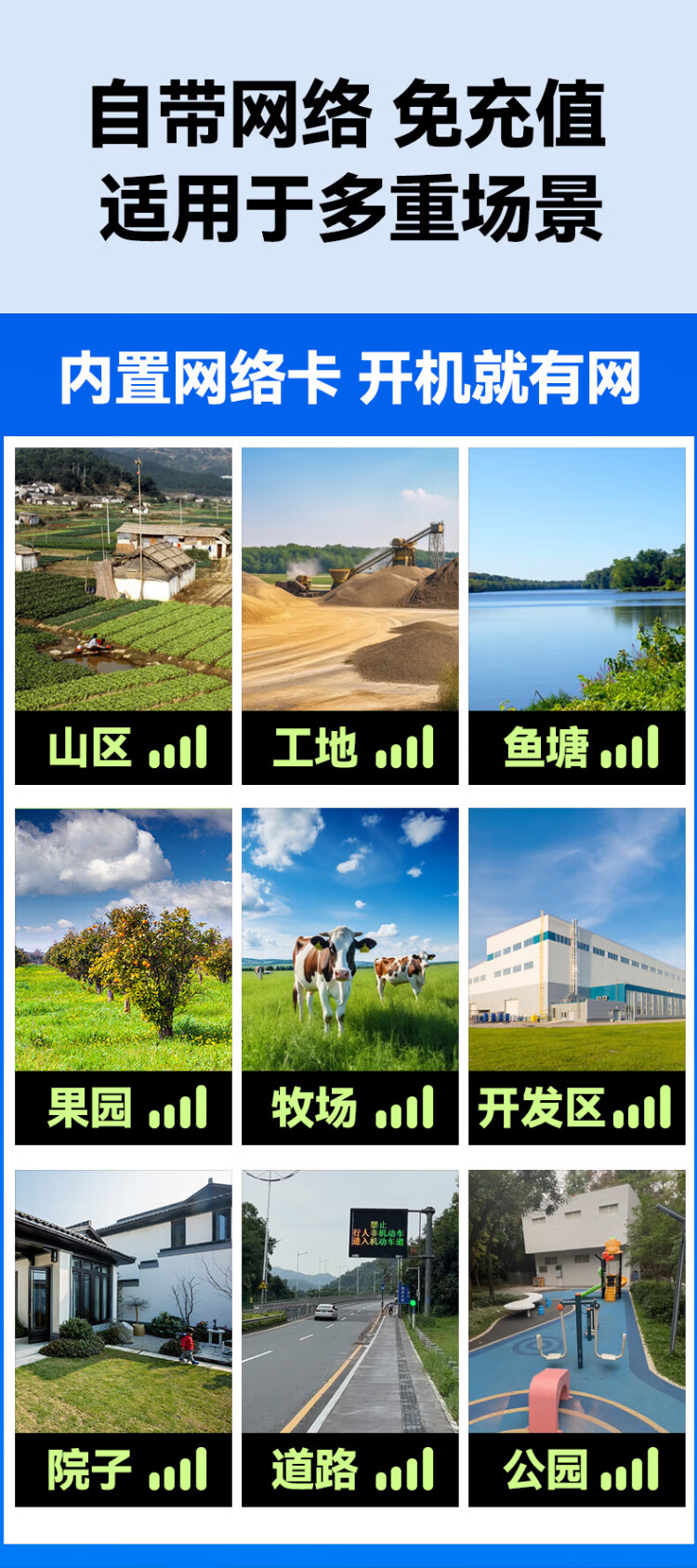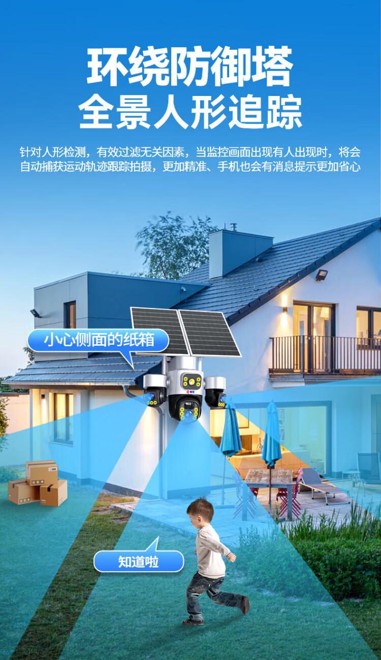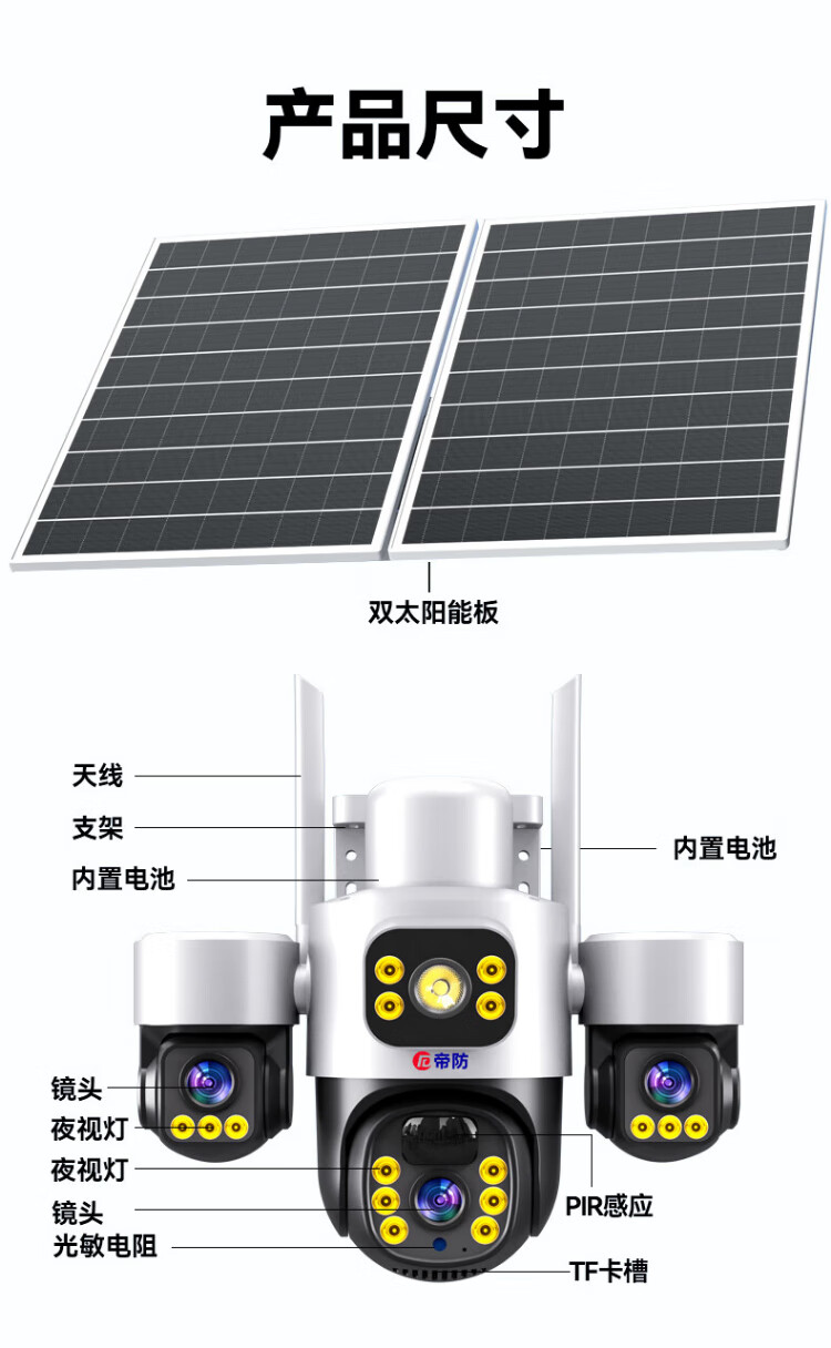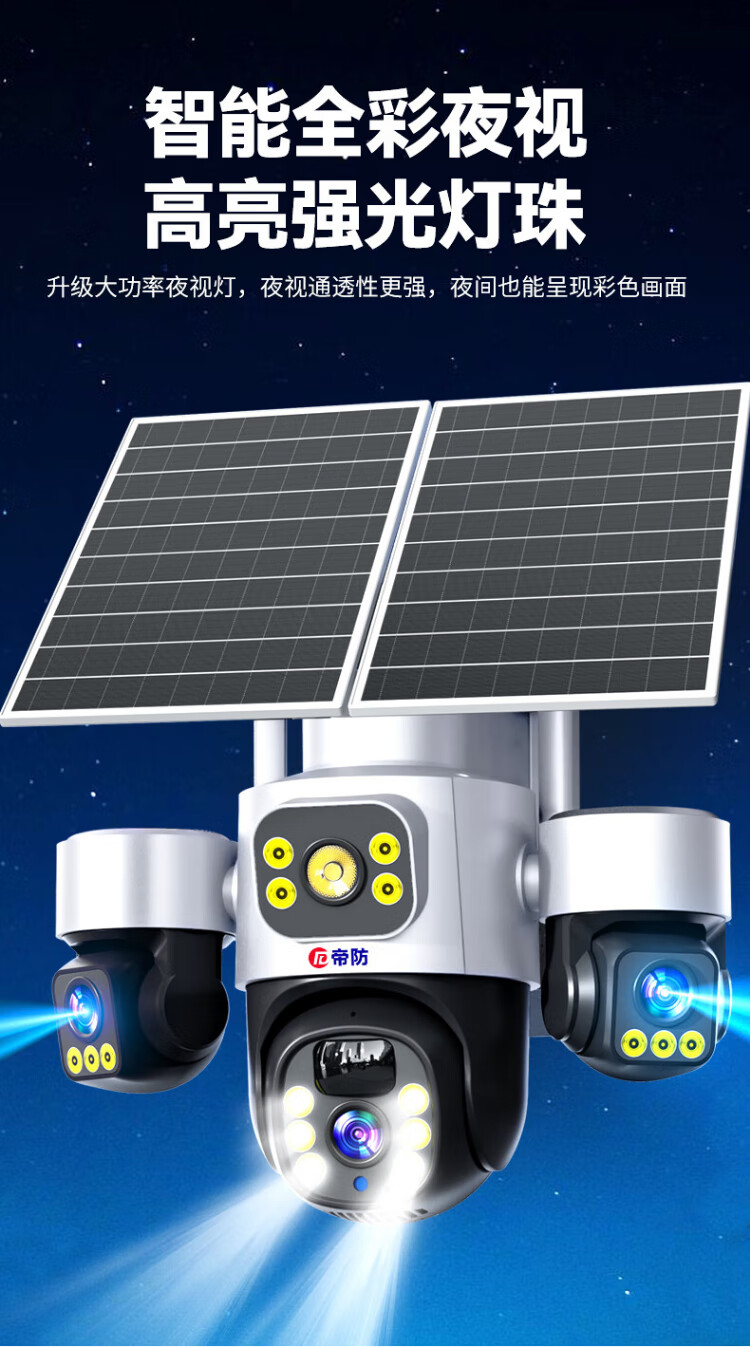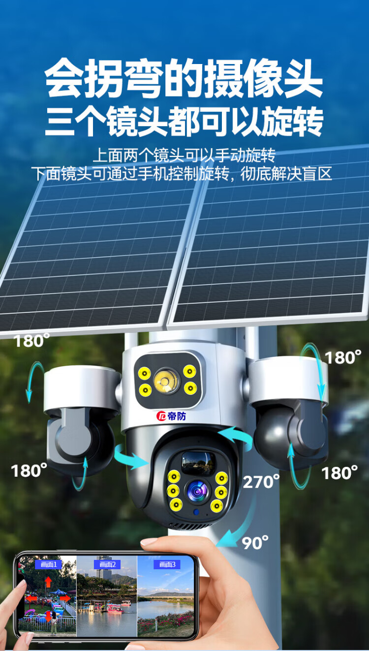 帝防太阳能户外监控摄像头无需连wifi免插电免流量无电无网超高清360度无死角带夜视全彩室外防水 4G单板三画面 5MP+智能人形追踪+64G