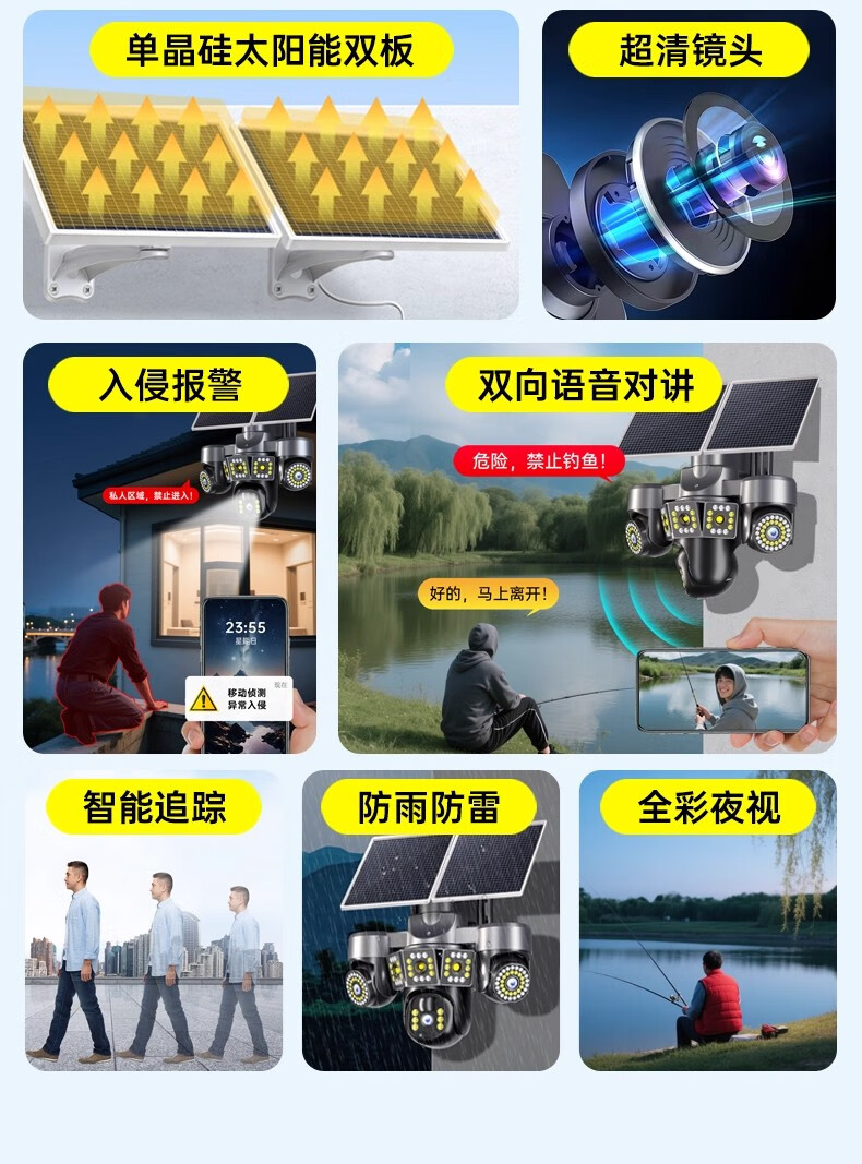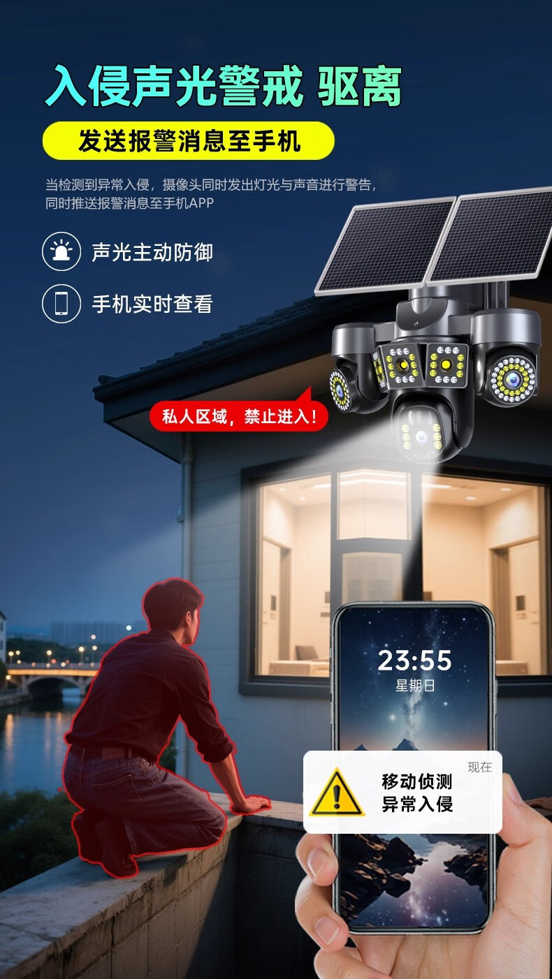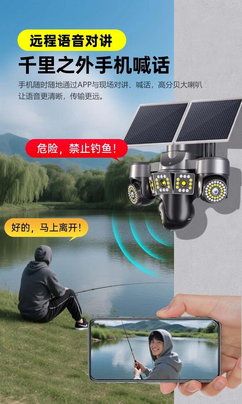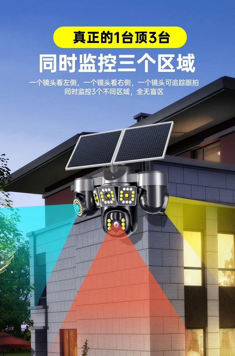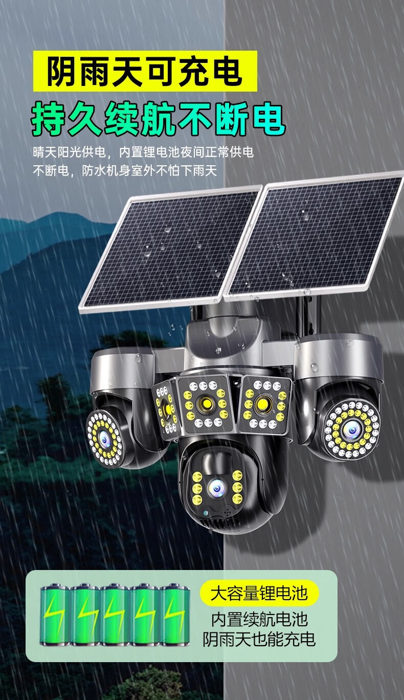 Солнечная камера AOC5G без питания и сети, пожизненный бесплатный трафик, панорамное полноцветное ночное видение высокой четкости на 360 градусов, отслеживание мобильного телефона, удаленный дом, Wi-Fi, бесплатный наружный монитор в сельской местности, шесть двигателей и вращение трех объективов + без питания и сети + двойные солнечные панели мощностью 20 Вт, бесплатно 99 лет трафика + без подзарядки + 30-дневная циклическая запись