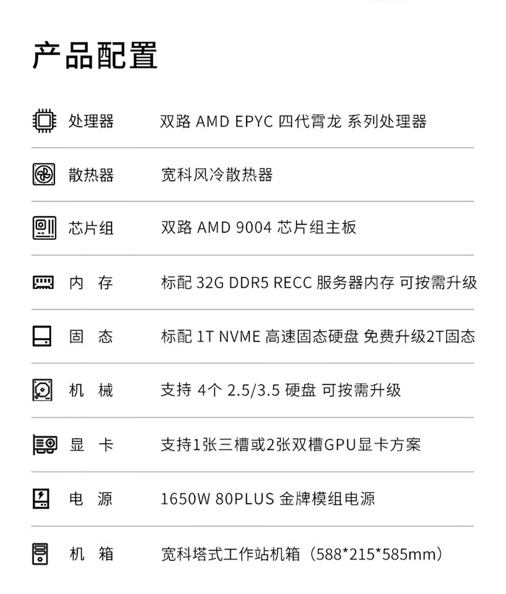 宽科双路EPYC霄龙9754/9654/9J14/9V94/DeepSeek/CPU建模渲染/仿真计算/有限元分析塔式主机工作站 双路9684X 192核384线程 2.55G 准系统32G D5内存+集成显卡