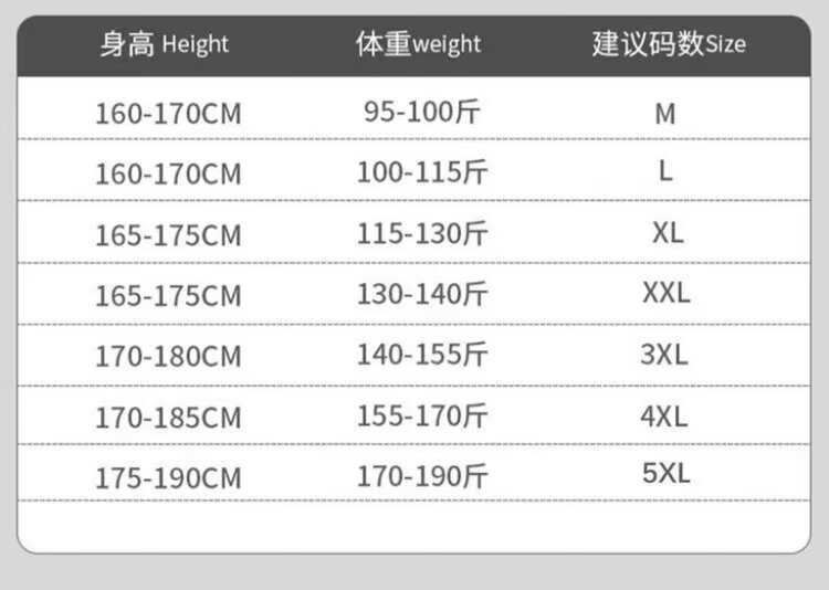 China (cm) 165 / 88-90 170 / 96-98 175 / 108-110 180 / 118-122 185 / 126-130