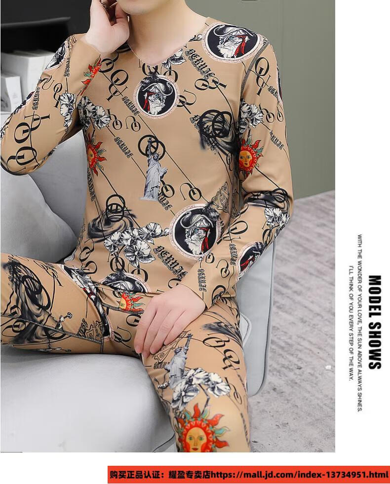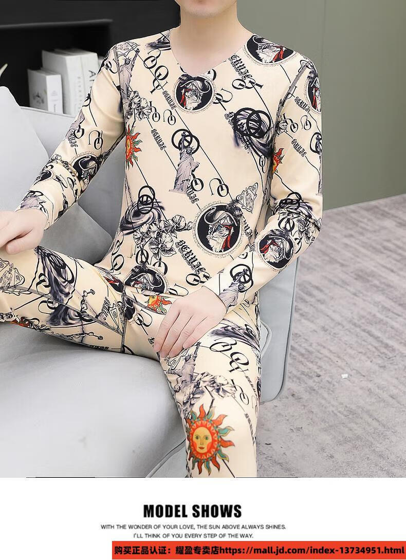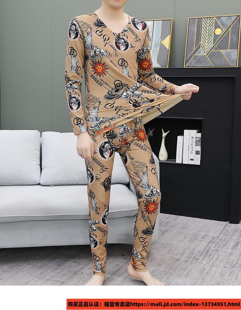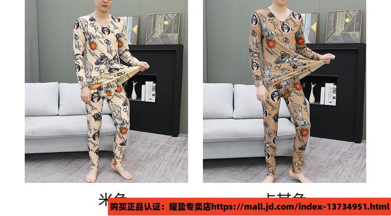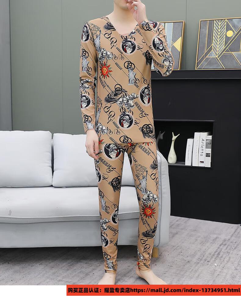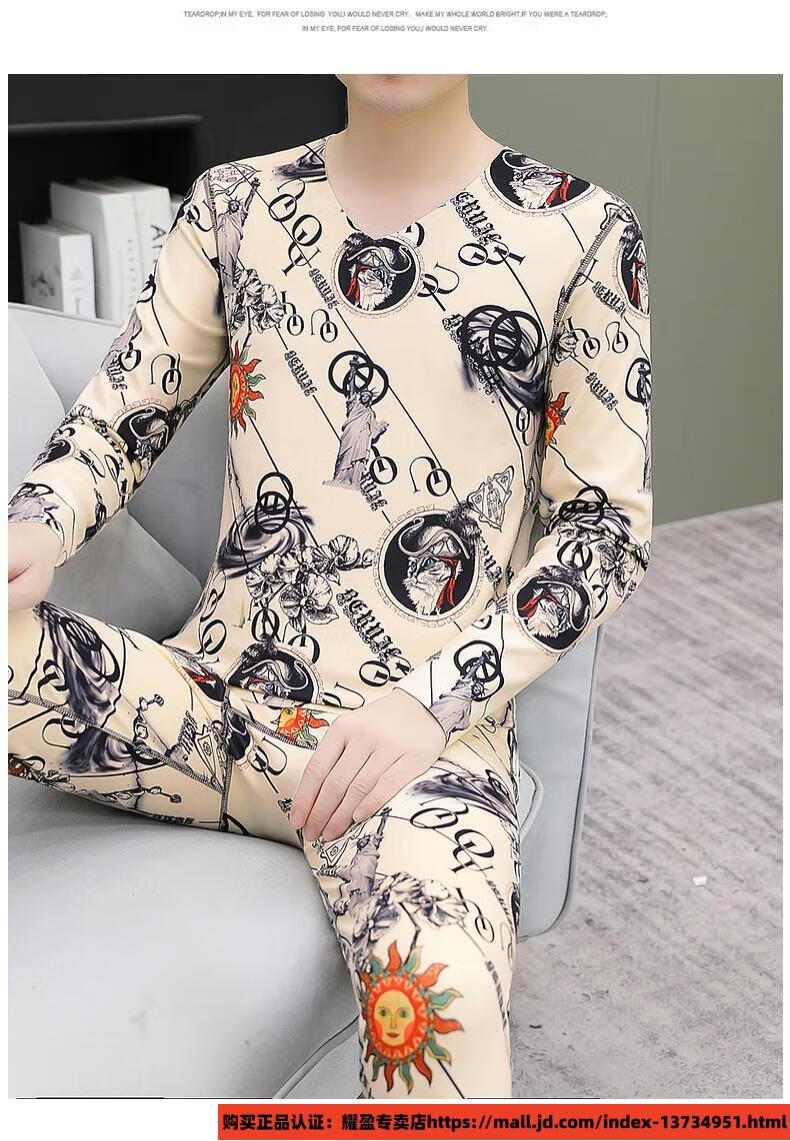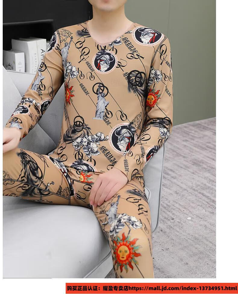 Modal Winter German Velvet Thermal Underwear Men's Suit Plus Velvet Thickened Autumn Clothes and Autumn Pants Trendy Brand Printed Slim Bottoming Shirt Khaki L (85-109Jin Jin is equal to 0.5kg)