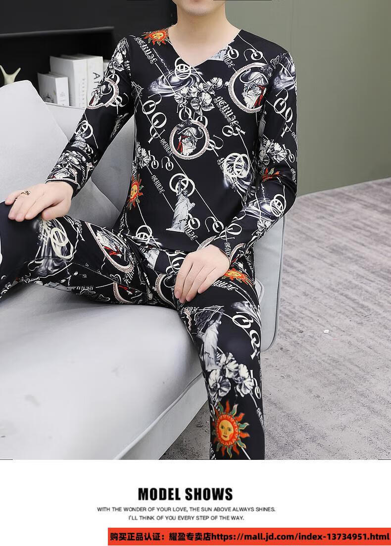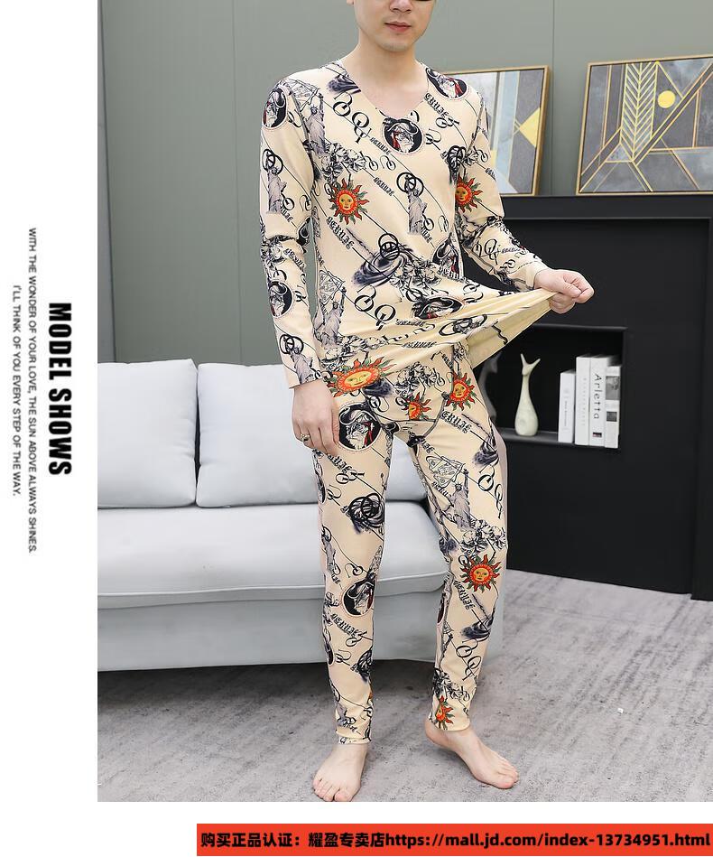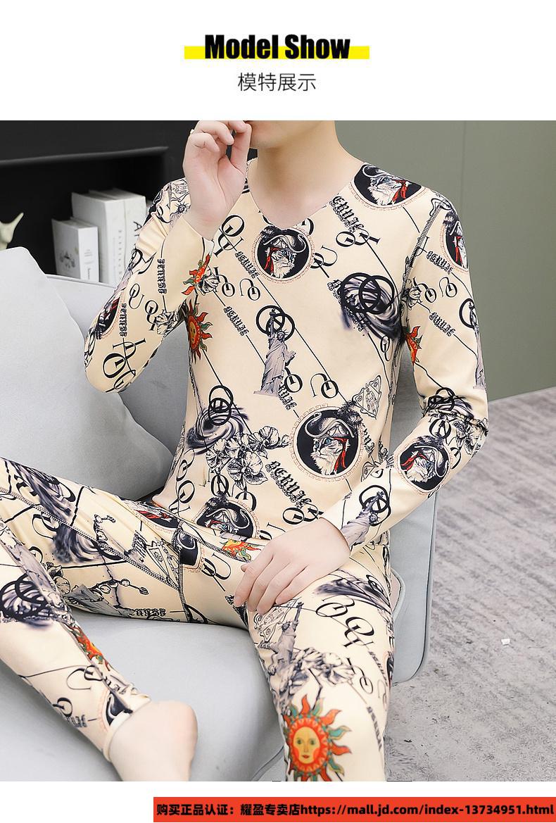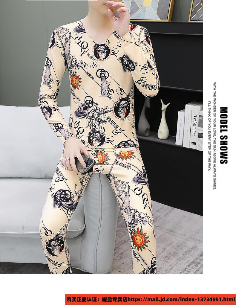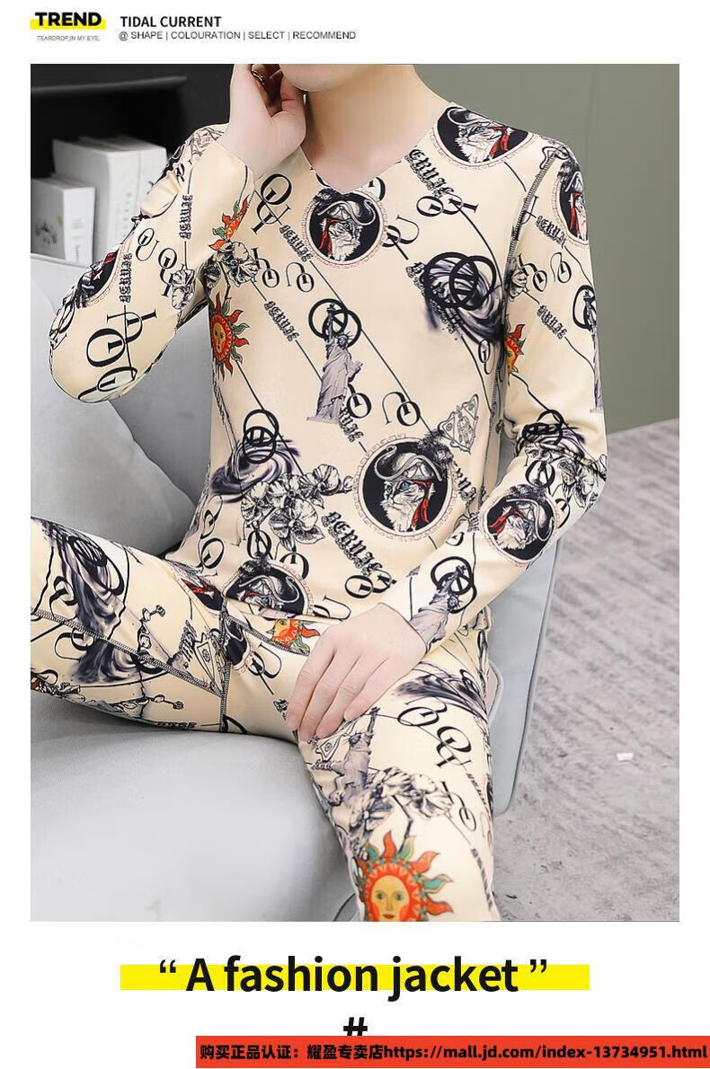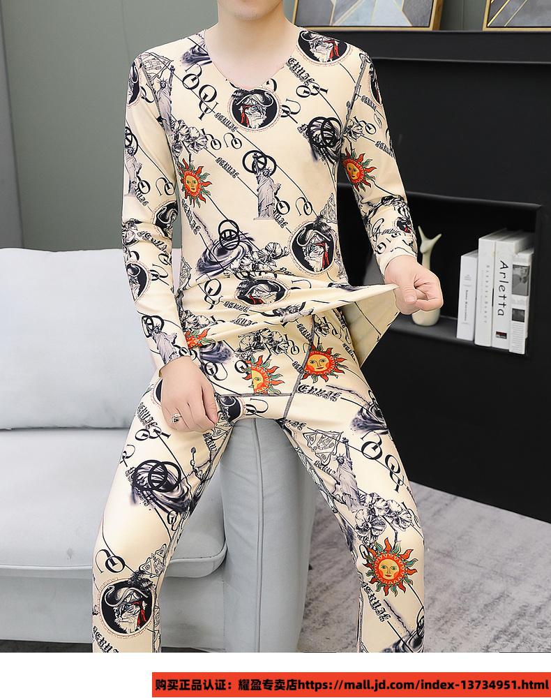 Modal Winter German Velvet Thermal Underwear Men's Suit Plus Velvet Thickened Autumn Clothes and Autumn Pants Trendy Brand Printed Slim Bottoming Shirt Khaki L (85-109Jin Jin is equal to 0.5kg)
