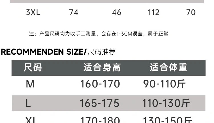 China (cm) 165 / 88-90 170 / 96-98 175 / 108-110 180 / 118-122 185 / 126-130