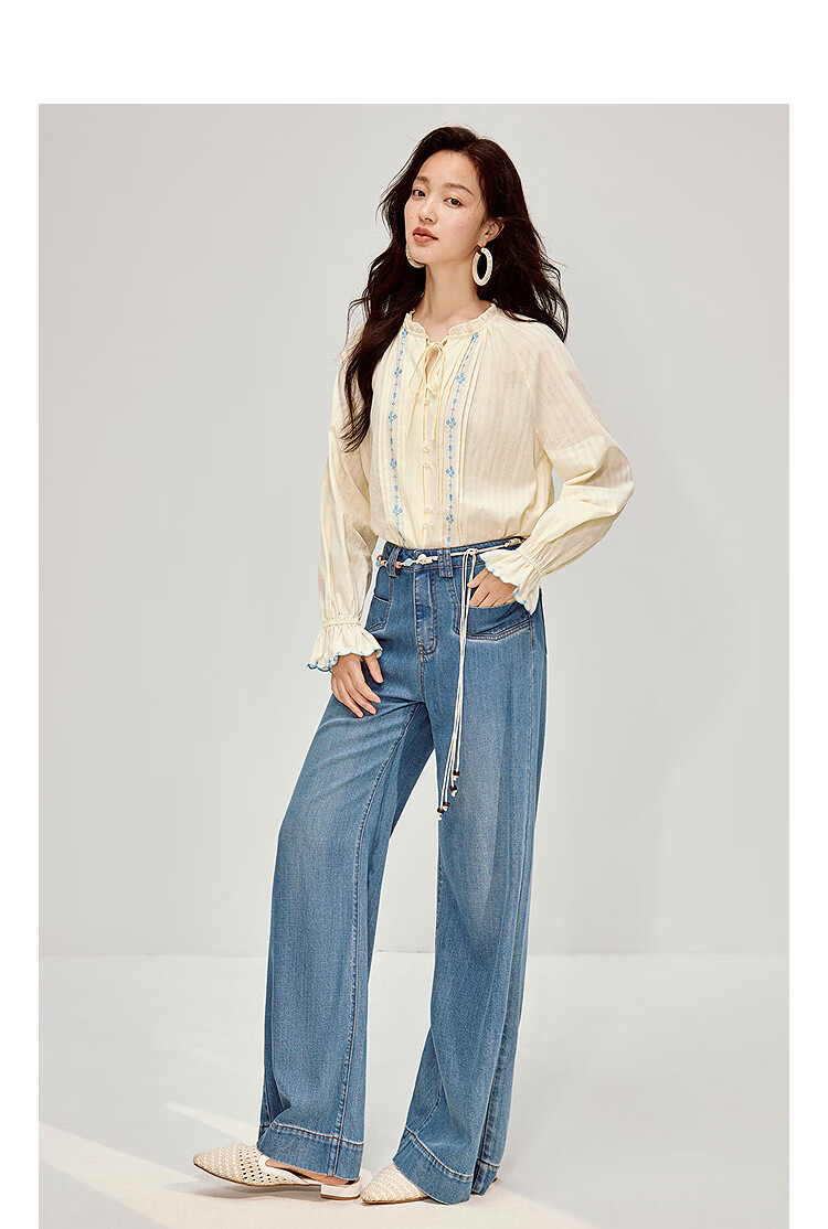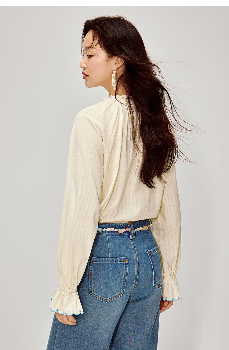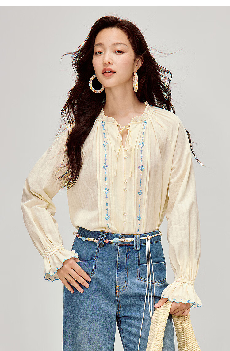 INMAN contrast color embroidered lace temperament shirt 2026 spring women's new simple long-sleeved shirt beige M