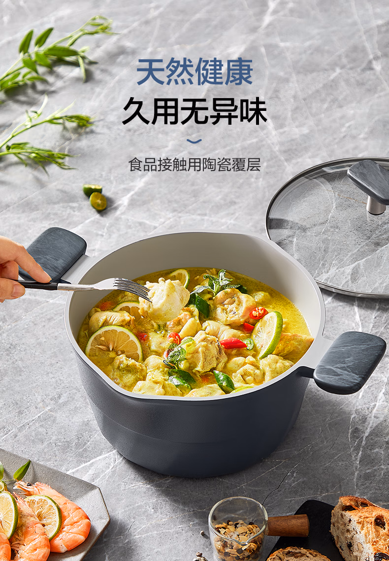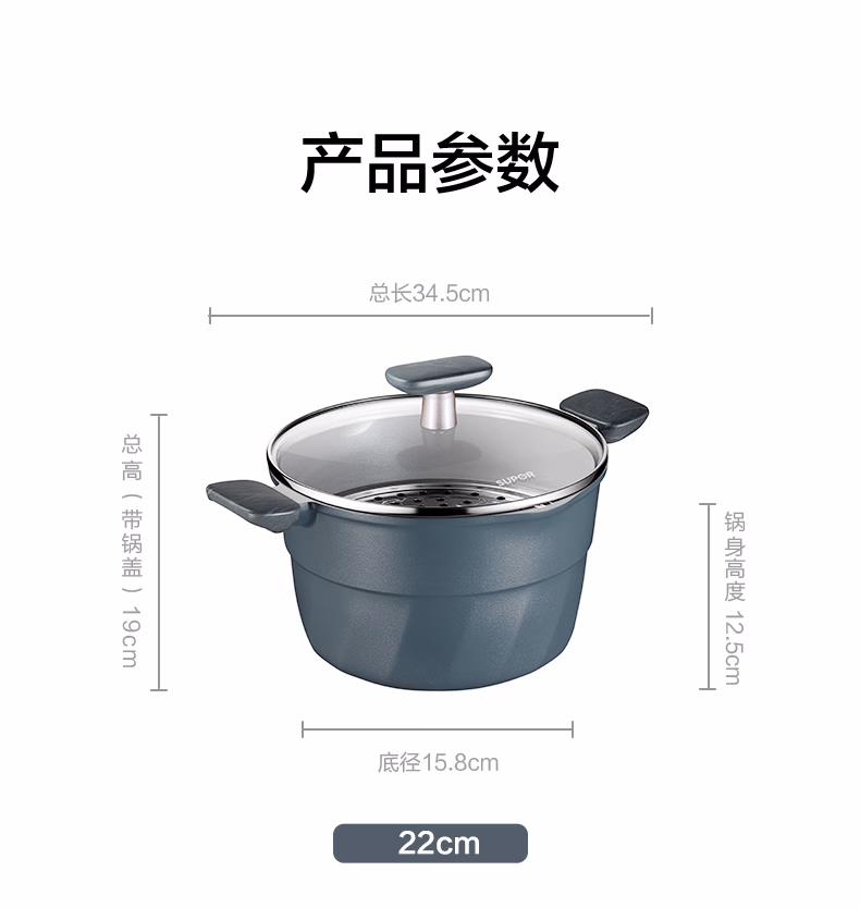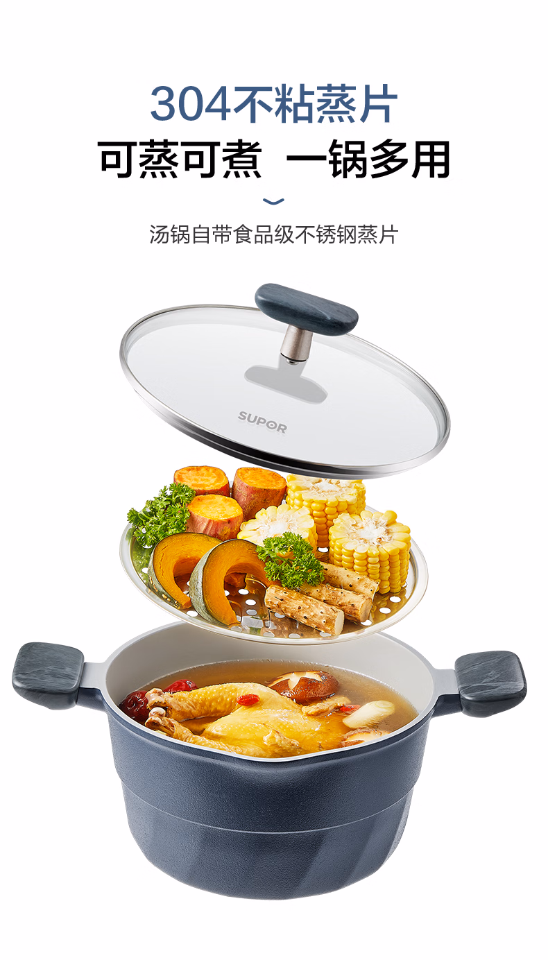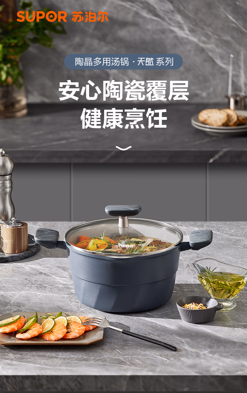 Supor steamer ceramic non-stick pot soup pot household cooking pot stew pot binaural stew pot star stone non-stick ceramic crystal multi-purpose soup pot 22CM with steaming grate